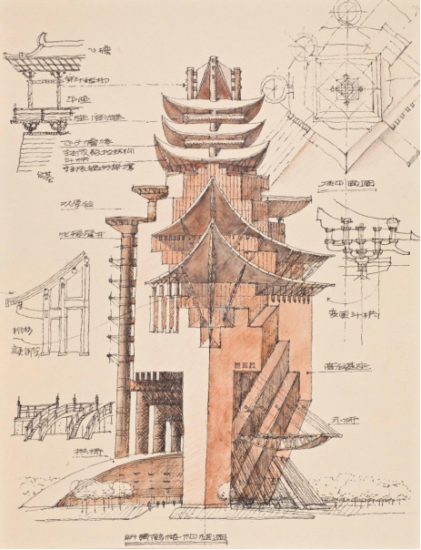 Design of New Yellow Crane Tower by Chen Shun’an, unknown year, paper painting,49x60cm