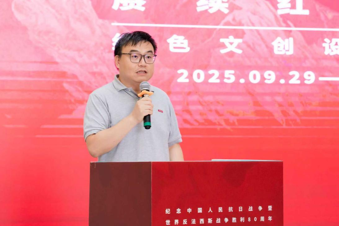 开幕式上,赵飞代表指导教师发言。他表示,本次展览围绕“铸魂开物”主题,从设计的本质出发,阐述了红色文创设计的精神内核与实践路径,深入挖掘红色精神的当代价值,实现从“叙事”到“转译”、从“再现”到“再生”、从“符号”到“融入”的转化,让红色文化真正融入日常生活,实现精神赓续。同时鼓励青年学子以设计为媒介,传承红色基因,展现文化自信与创新活力。