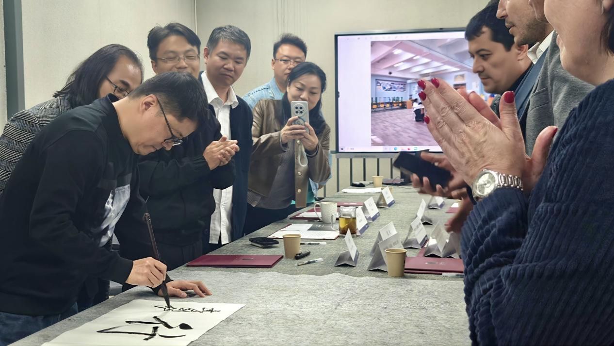 活动现场,中国画学院书法教师聂国强现场挥毫,以苍劲有力的笔法创作“艺路同行”书法作品。作品既彰显中国书法艺术的独特魅力,又传递出双方携手共进的美好愿景,被乌方代表团郑重珍藏,成为此次交流的重要文化信物,生动定格中乌艺术界的深厚友谊。