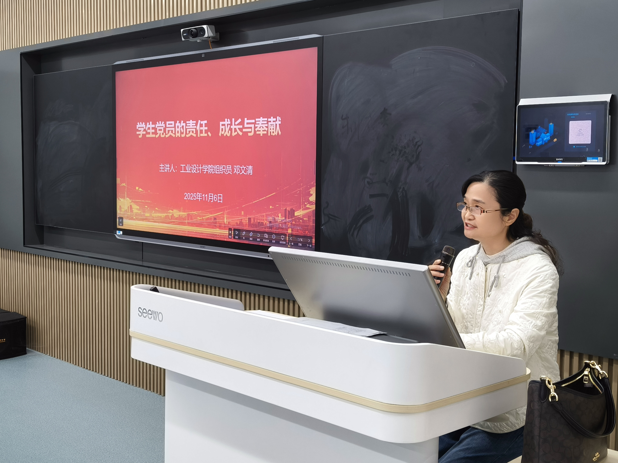 工业设计学院党委组织员邓文清以《学生党员的责任、成长与奉献》为题,从深刻认识学生党员的双重身份与核心责任、准确把握学生党员的成长路径与内在要求、自觉践行学生党员的奉献精神与时代担当三个方面,结合张桂梅、南仁东、华为UX设计团队的事迹,勉励学生党员以坚定的理想信念引领人生航向,以过硬的专业本领服务社会发展,以无私的奉献精神彰显党员本色。