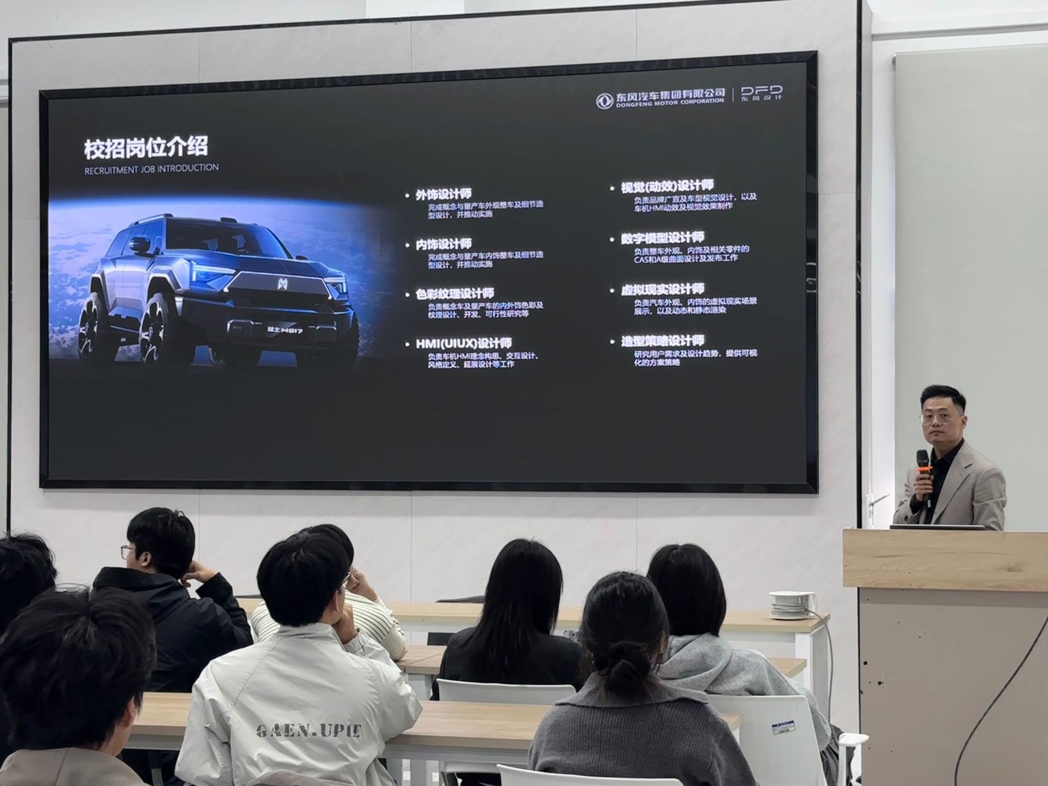 祝涵通过企业宣传片与现场讲解,系统介绍了东风汽车全球设计中心的发展历程、核心业务及人才引进计划,重点展示了智能网联汽车、可持续设计等前沿领域的布局,并针对同学们关心的岗位要求、职业发展路径等问题进行了细致解答。