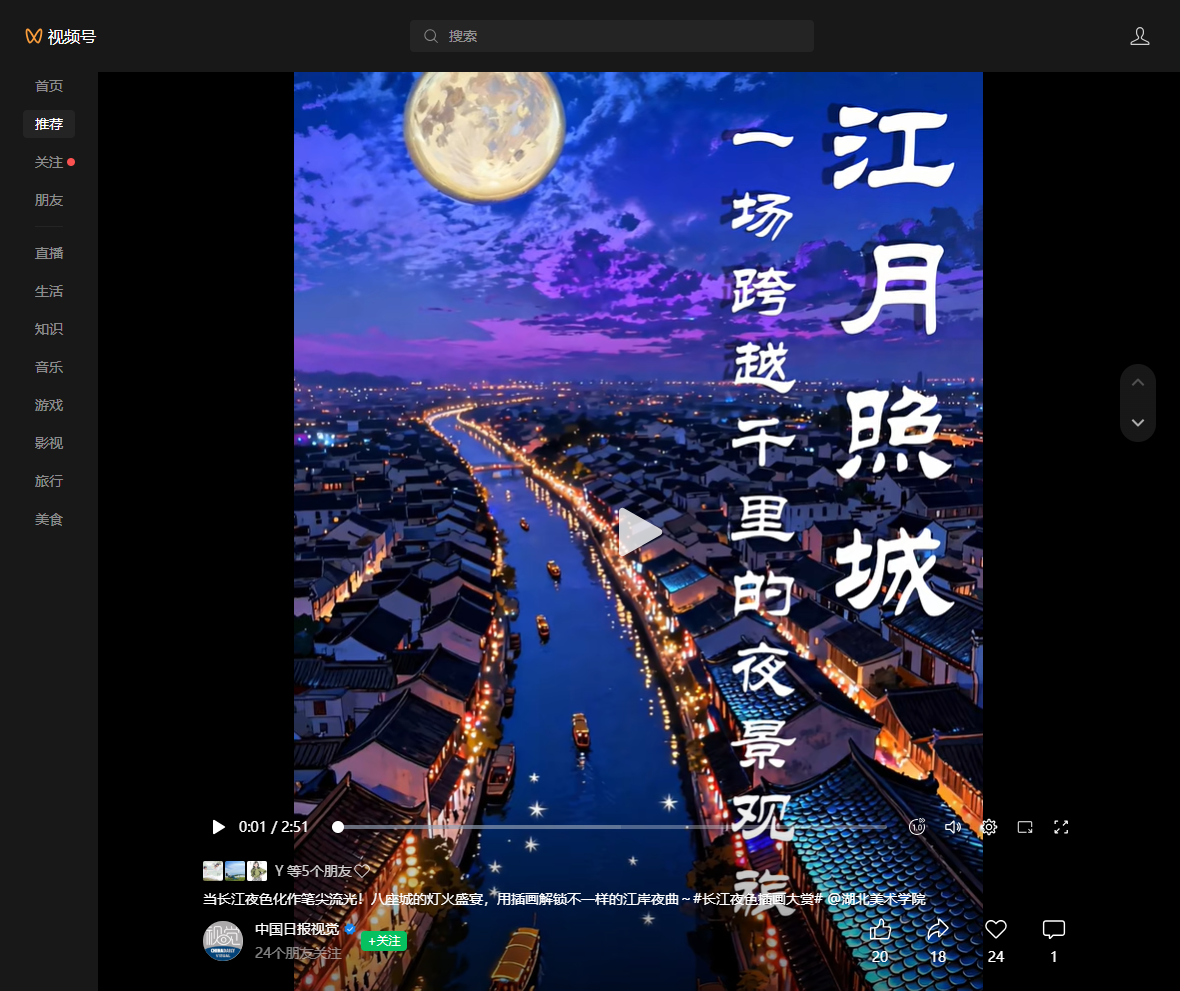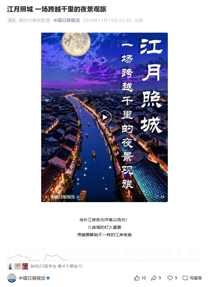 影视动画学院“动‘话’时代艺绘中国”工作室《长江生态与人文》系列第五期作品《江月照城 一场跨越千里的夜景观旅》在中国日报网、中国日报微信公众号、中国日报视频号、中国日报官方微博等多媒体平台发布。