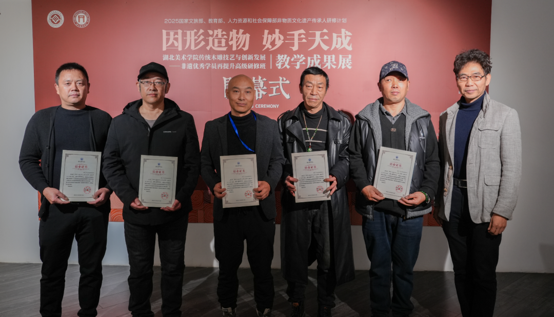 初冬的昙华林,艺术气息愈发醇厚。2025年11月,传统木雕技艺与创新发展高级研修班结业仪式暨教学成果展在湖北美术学院昙华林校区美术馆隆重举行。来自全国各地的学员、教师代表、非遗传承人及院校领导齐聚一堂,共同见证这一场传统技艺与当代思维碰撞交融的盛会。出席的校外嘉宾有:武汉木雕老艺人孙汉生、武汉城市学院教授(武汉木雕代表性传承人)张静、马来西亚理工大学博士郭珍;校内嘉宾有:湖北美术学院实验艺术学院组织员彭柱武、湖北美术学院继续教育与培训学院院长何明、湖北美术学院实验艺术学院党委书记李宁、湖北美术学院雕塑与公共艺术学院教师李冰、湖北美术学院继续教育与培训学院办公室主任李志敏和全体教职工以及湖北美术学院研究生代表。