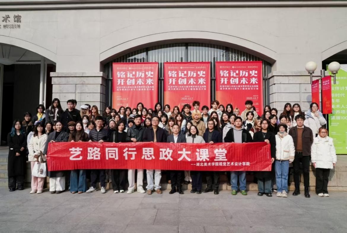 下午,师生前往至昙华林校区,参观由中国美术家协会、湖北省文学艺术界联合会和湖北美术学院联合主办的“铭记历史·开创未来——纪念中国人民抗日战争暨世界反法西斯战争胜利80周年”主题海报设计展。每一幅作品都以鲜明的视觉符号、强烈的色彩对比与深刻的主题表达直击人心。展出的作品将烽火岁月里的坚守与抗争、和平年代的珍惜与担当转化为可感知的视觉语言,既是对革命先烈的深切缅怀,也是对伟大抗战精神的生动诠释,更是新时代艺术工作者践行使命担当的具体体现。学校副校长张炼现场为同学们讲解了作品的历史意涵与视觉手法,引导学生感悟责任担当,厚植爱国主义情怀。