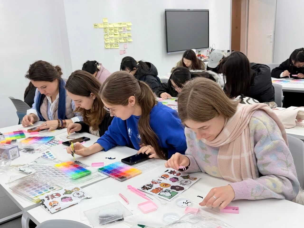 活动过程中,彩色的拼豆在同学们手中流转,大家专注构思,细心拼摆,遇到拼接难题时互相支招、分享技巧。艺术教育学院学生主动与同伴交流拼豆技巧,从图形布局到色彩搭配倾囊相授;俄罗斯交换生们饶有兴致地尝试,虽语言不同,却通过手势、画面与中国同学沟通创作思路,遇到拼接难题时,中外学生互相支招,豆粒在耐心拼接中逐渐成型。不少同学坦言,拼豆过程让自己放下学业压力,成就感与治愈感油然而生。