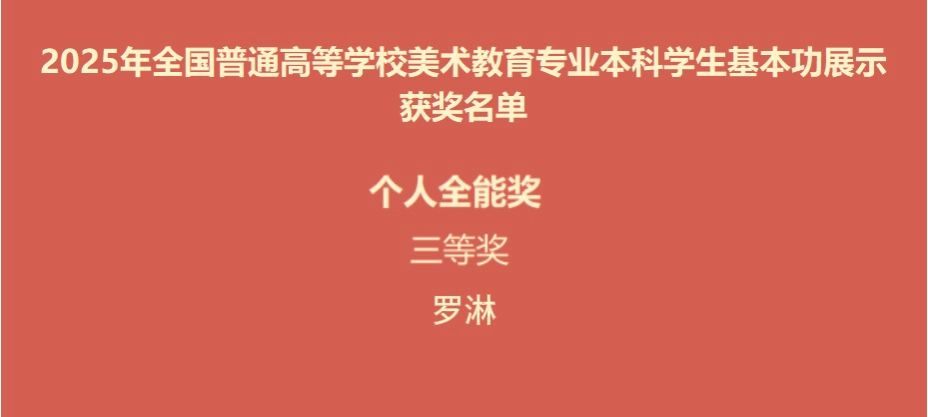 近日,教育部公布2025年全国普通高等学校美术教育专业本科学生基本功展示评选结果。在本次展示活动中,艺术教育学院美术教育专业2022级本科生罗淋凭借全面的专业素养斩获个人全能三等奖。