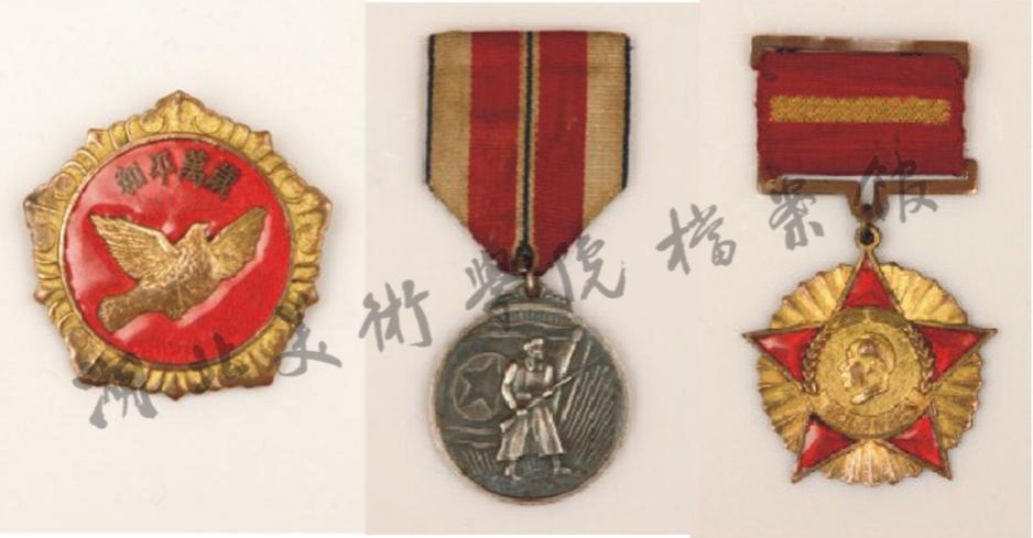 宁璘荣获的抗美援朝军功章、纪念章3枚 从左到右依次为:中国政府颁发的中国人民赴朝慰问团赠予志愿军的“和平万岁”纪念章、朝鲜政府颁赠的中国人民志愿军军功章、中国政府颁发的抗美援朝纪念章