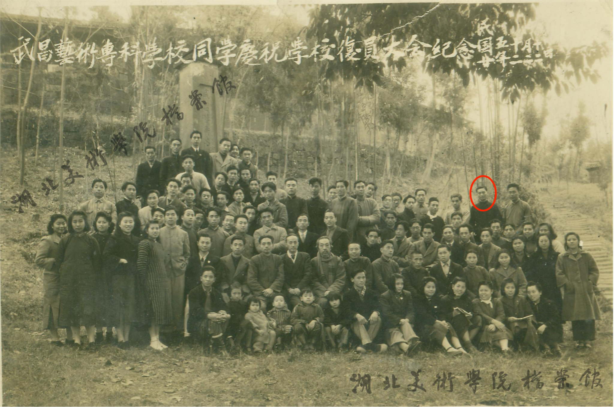 1946年12月22日,武昌艺术专科学校同学庆祝学校复员大会纪念(红圈处为宁璘)
