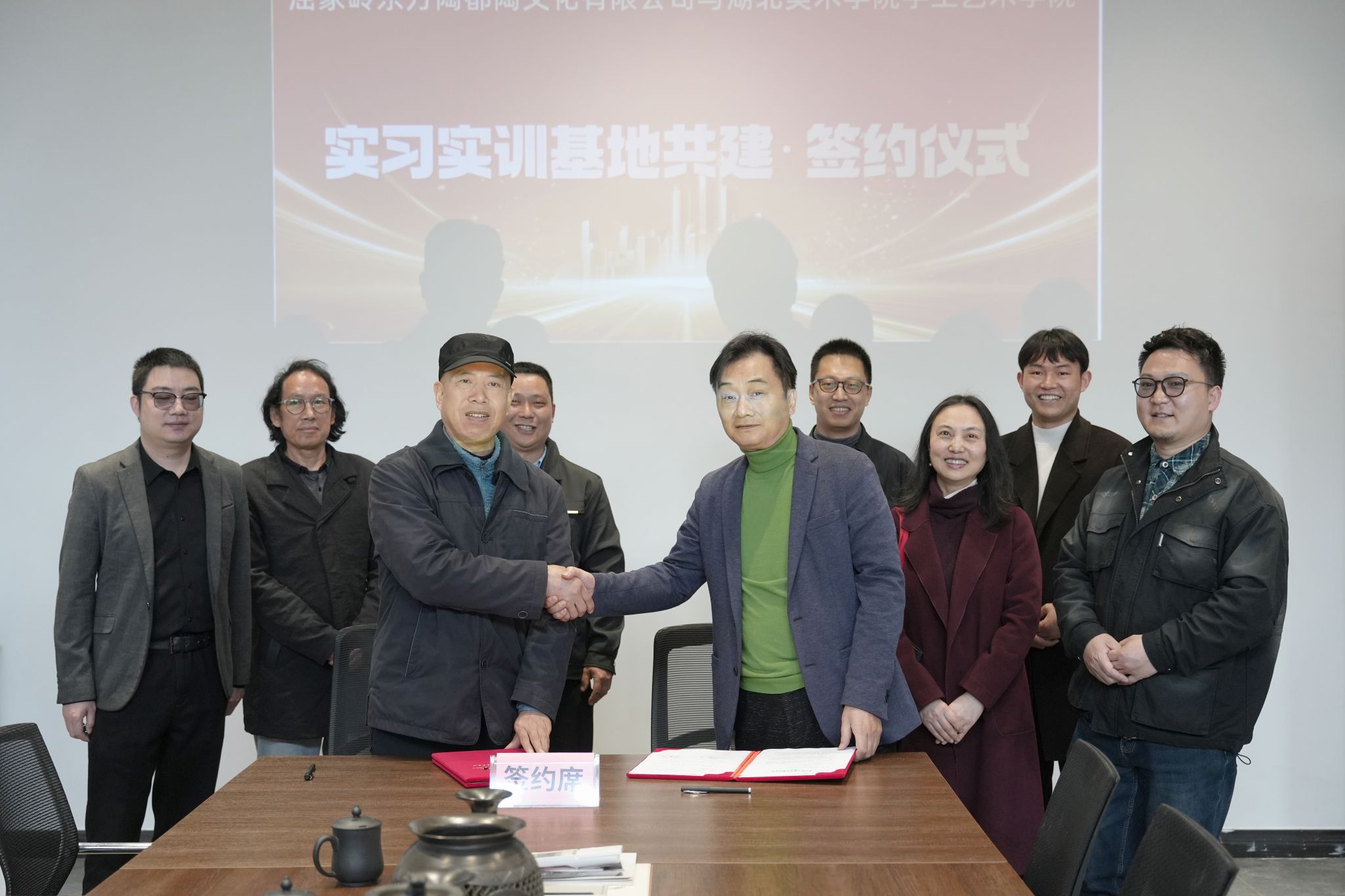 为进一步推动校企合作,深化实践教学平台建设,拓宽学生实践与就业渠道,3月25日,手工艺术学院党委书记程宁、副院长陈君一行7人前往屈家岭东方陶都陶文化有限公司,与湖北五三农场集团有限公司负责人罗均瀚、屈家岭东方陶都陶文化有限公司董事长汤朝龙、副总经理徐庆勋、湖北省工艺美术师邓万春,就共建实习实训基地等事宜开展交流,并举行授牌签约与访企拓岗活动。