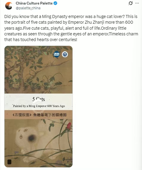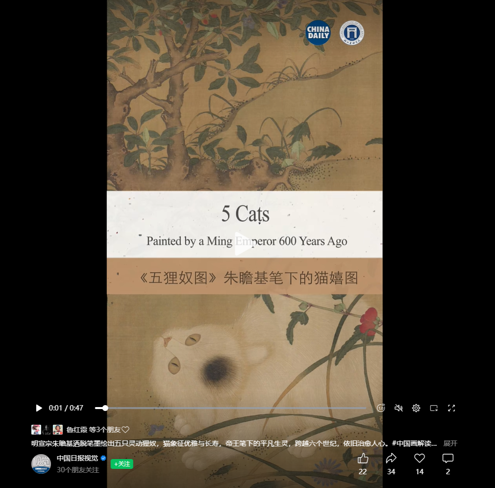 影视动画学院“动‘话’时代 艺绘中国”工作室作品《〈五狸奴图〉:朱瞻基笔下的猫嬉图》在中国日报网、中国日报视频号、中国日报官方微博、China Culture Palette等多媒体平台发布。作品以动画语言生动还原五只狸奴嬉戏百态,将传统工笔神韵与现代数字艺术融合,既展现了中华传统书画的雅致意趣,又以年轻化的表达方式为讲好中国艺术故事提供了全新路径与鲜活载体。