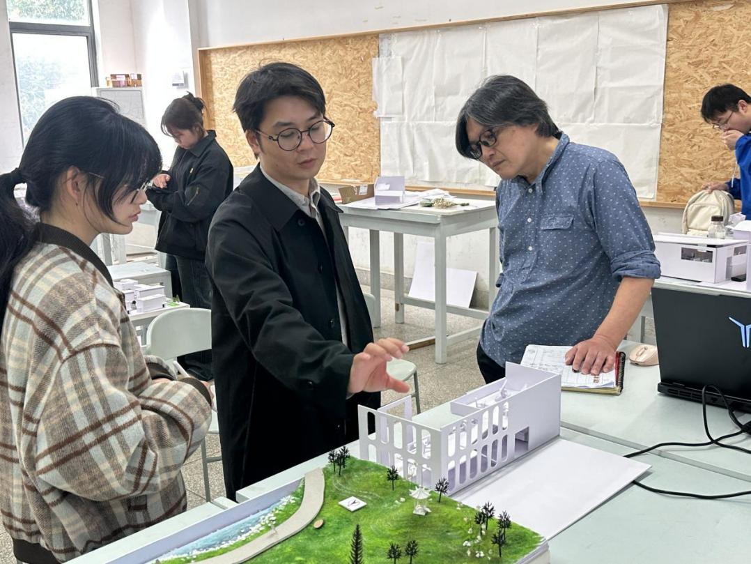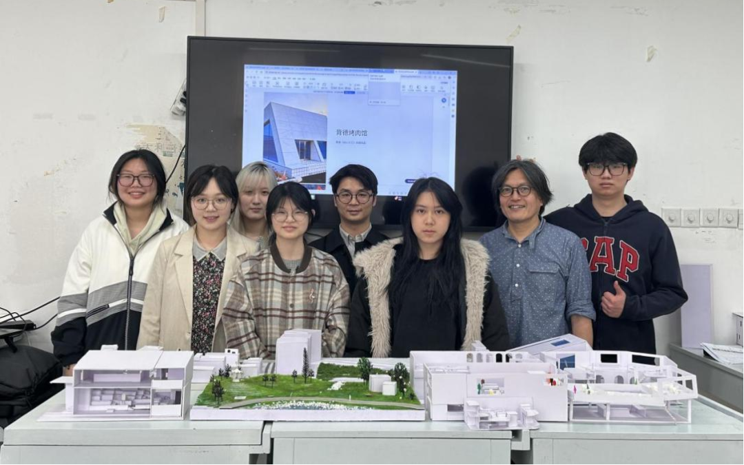 在为期四周的课程中,桥本润教授主讲小型复合餐饮设施设计相关内容,围绕空间体验、行为动线与场所精神的关联,讲解设计领域基础理论与多摩美术大学课程理念,引导学生理解设计对人与环境互动的回应逻辑。桥本润教授带领学生完整经历了业态考察与地块选择、概念构思、模型制作、家具布局深化至效果图表现的小型建筑设计全流程,全程对每位学生逐一指导,结合学生创意给出修改建议并提供参考作品。
