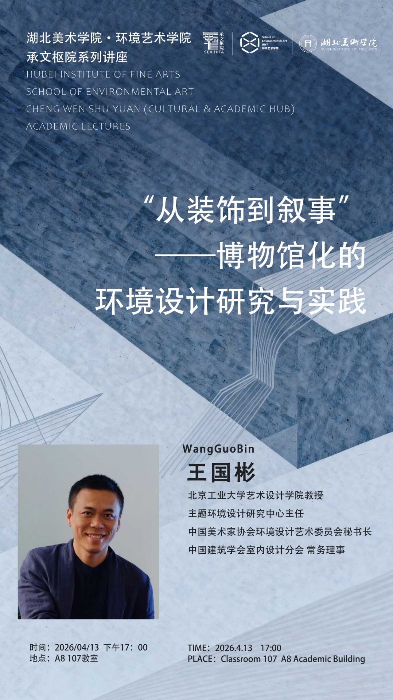 为推动环境设计学科前沿理念与实践经验深度融合,助力学科发展与人才培养,4月13日下午,环境艺术学院“承文枢院”系列讲座在A8-107教室举行。本次讲座邀请北京工业大学艺术设计学院教授、中国美术家协会环境艺术委员会秘书长王国彬教授担任主讲嘉宾。他以“‘从装饰到叙事’——博物馆化的环境设计研究与实践”为主题,为学院师生带来了一场兼具理论深度、实践广度与文化温度的学术讲座。环境艺术学院部分师生参加讲座,讲座由环境艺术学院院长何凡主持。