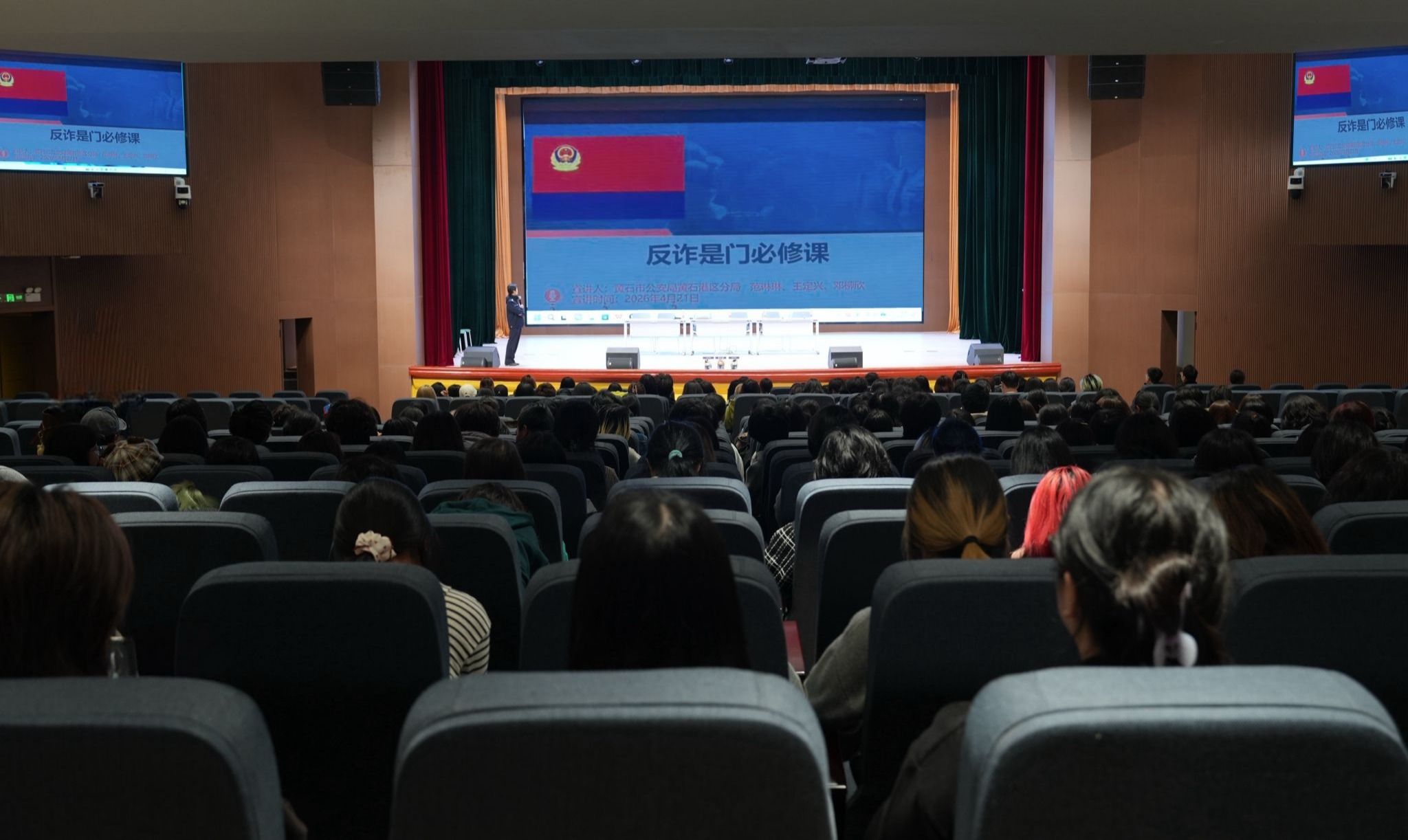 4月21日,黄石协同创新示范基地联合黄石市公安局黄石港区分局、黄石港区消防救援大队,在示范基地大礼堂针对700余名2025级本科新生开展防诈反诈、消防安全、防溺水安全知识专题讲座。