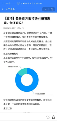 为了更好的的服务于学生群体平台特设“大工头条”推荐引擎通过聚合校内海量资讯,为学生群体推荐通知、便捷查询、招聘信息等息息相关的资讯内容,将校园内发生的事情最快速地传递到关注校园生活的用户手中,使学生群体“随时、随地、随身”掌握校内动态,持久吸引校内受众的关注。“大工头条”补充高校校园媒体的传播渠道,为学校行政决策提供了更多的参考。