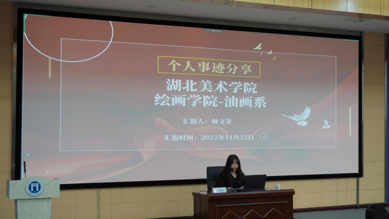 艺术人文学院青年教师辛宇博士以《学习二十大 做好学生干部》为题,向大家分享了自己从本科到博士研究生的成长经历,尤其是自己在湖北美术学院本科就读期间,从事学生社团管理等方面的心得体会,并告诉青年学子们做好一名学生干部,要心系党和国家、坚守理想与专业、密切联系师生、明确角色定位,敢于吃苦,乐于奉献,不抱怨,不消极,始终努力发挥先锋模范带头作用。