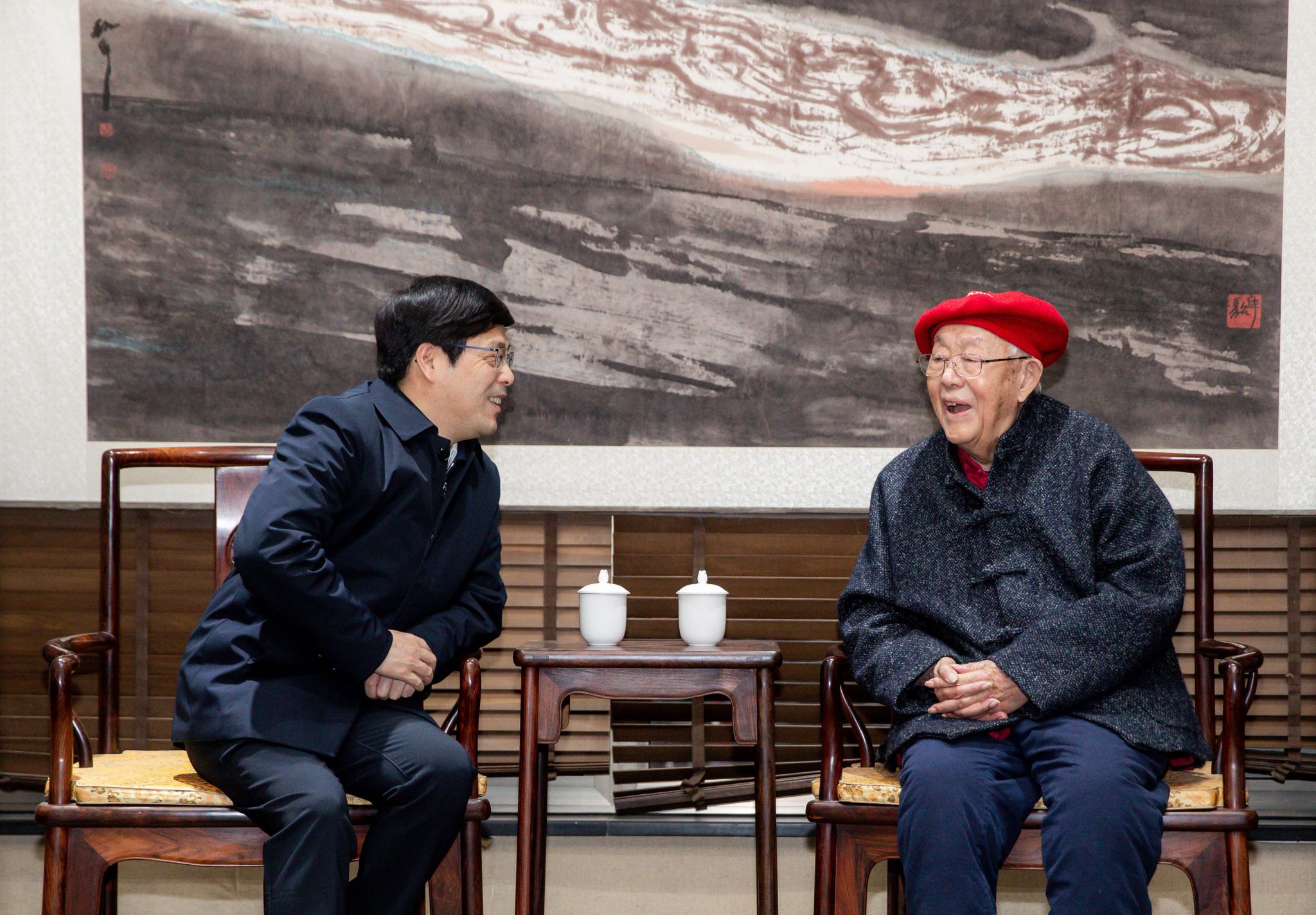 琚朝晖来到周韶华艺术中心亲切慰问95岁老艺术家周韶华,致以新年祝福。周老深情回忆自己青年时期被湖北的名山大川所吸引,就决定扎根湖北,荆楚文化深深滋养了自己的创作。琚朝晖称赞周老德高望重,德艺双馨,祝愿周老健康长寿,希望周老继续关心支持湖北文化事业发展。