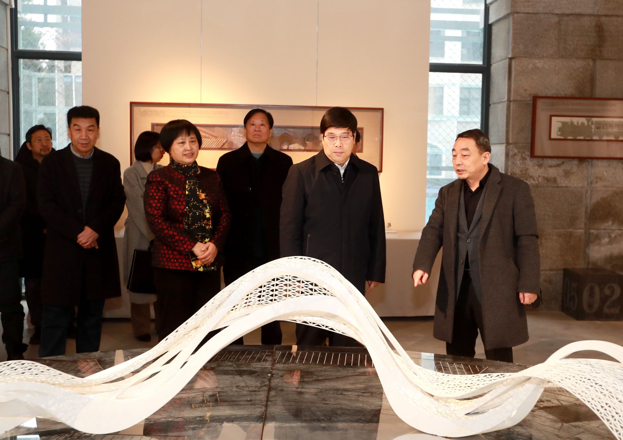 在文化发展公司展厅,琚朝晖参观城市空间美化成果展示,对学校在武汉地铁艺术站点建设与公共艺术品创作成果给予充分肯定。琚朝晖一行在校美术馆参观“东+西”大学生国际海报双年展和全国漆画学术邀请展,并走访获得过全国美展金奖艺术家与青年骨干教师工作室。