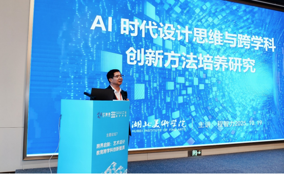 分论坛上汇聚了国内外知名专家学者,西交利物浦大学马泰·腾博默教授、重庆交通大学李伟湛教授、浪尖设计集团有限公司董事长罗成先生、中国矿业大学姚君教授、兰州理工大学苏建宁教授、上海电机学院周志勇教授、湖北工业大学胡珊教授、南京信息工程学院梁家年教授、湖北美术学院程智力教授等嘉宾分别进行了学术交流发言。程智力教授作《人工智能时代设计思维与跨学科创新方法的培养》主题报告。他聚焦于人工智能带来的颠覆性挑战与历史性机遇,系统探讨了未来设计教育的革新范式,强调新时代的设计教育必须超越传统“传道授业”的模式,弥合“人类智慧”与“人工智能算力”之间的鸿沟,培养学生与AI高效协同的共创能力和引领未来的高阶创新思维。