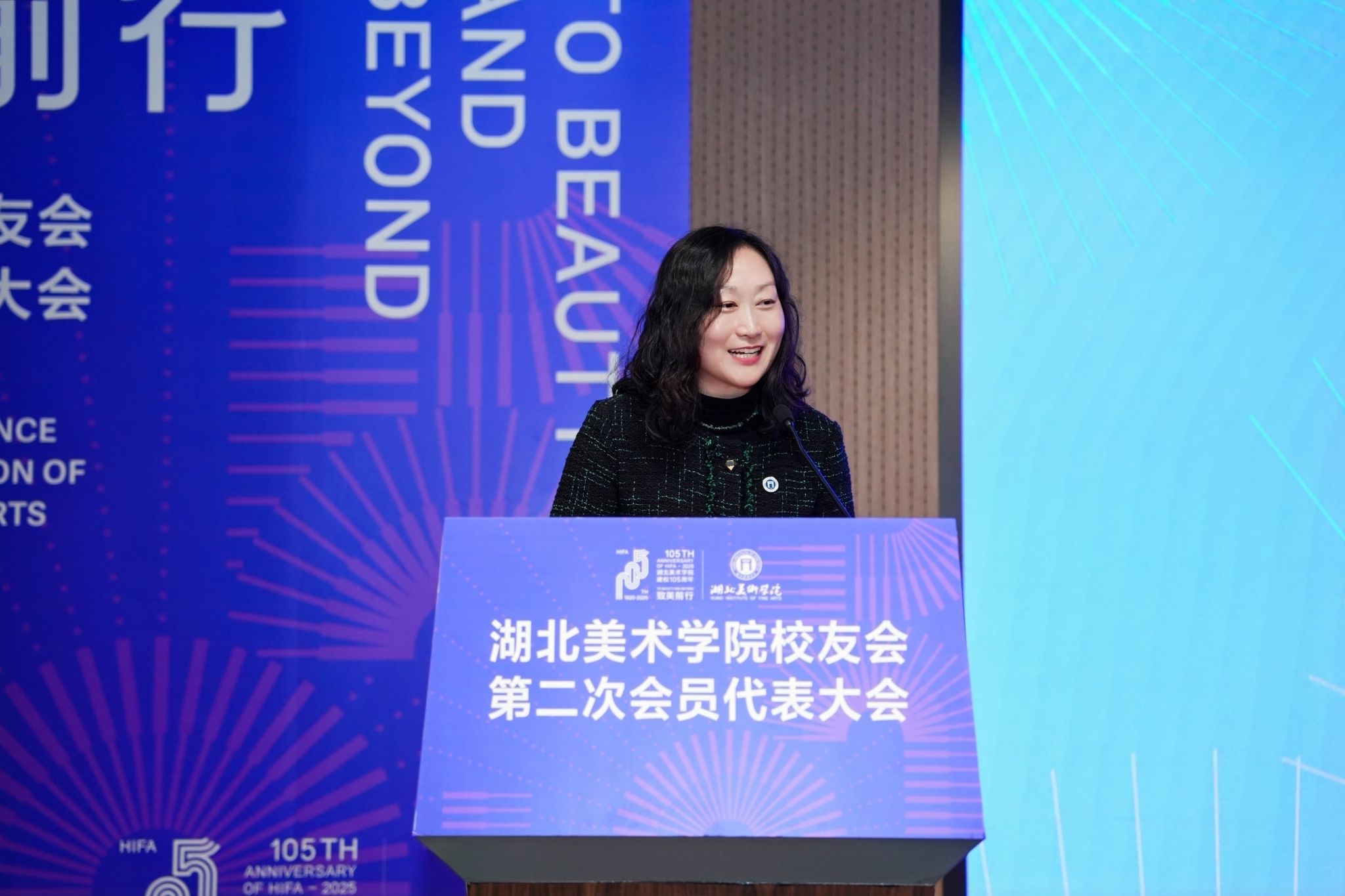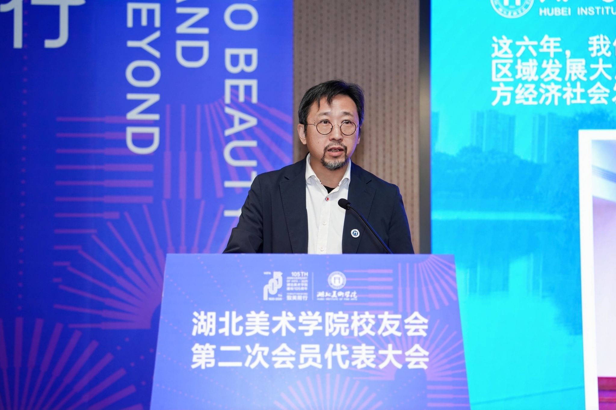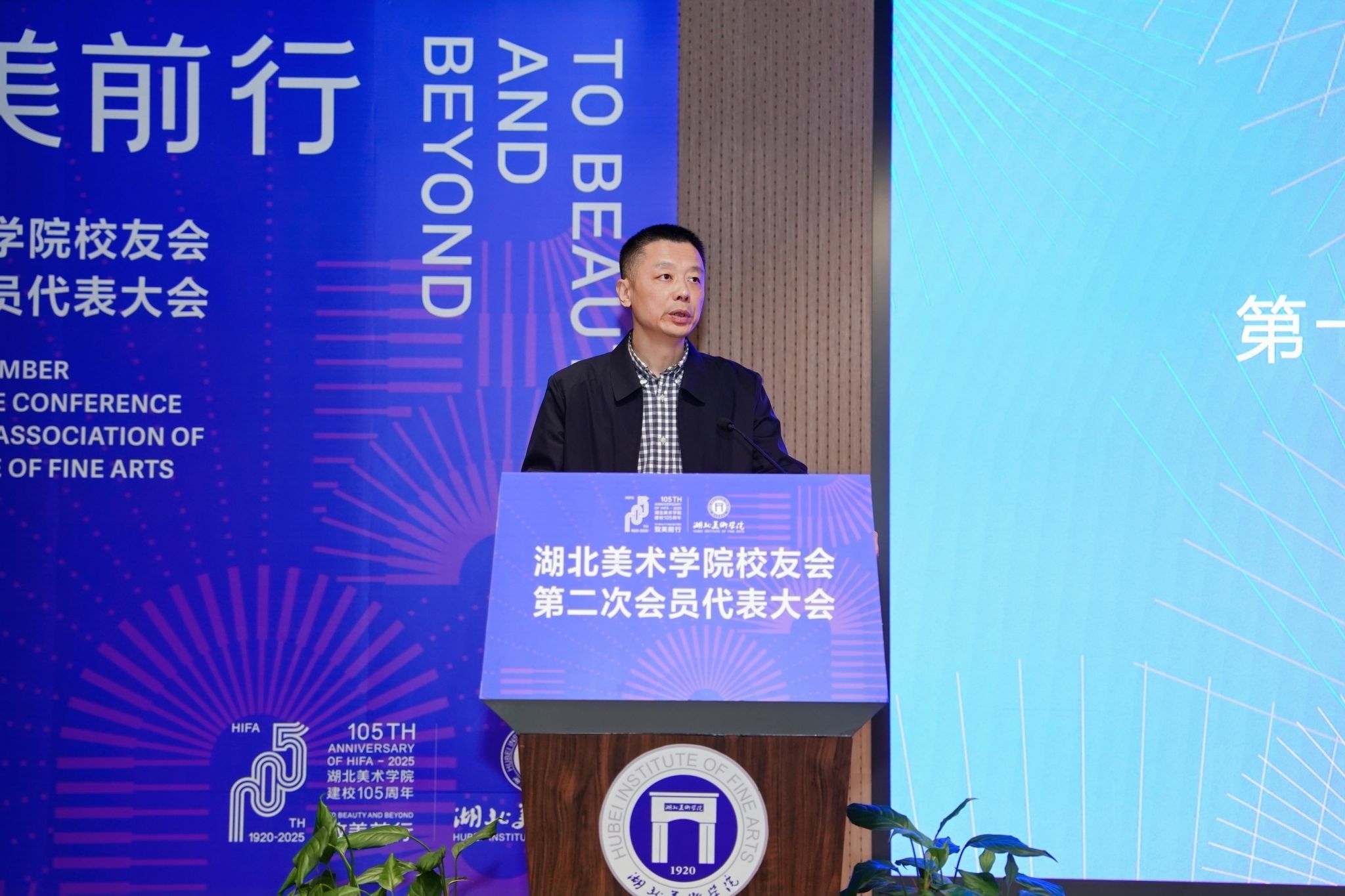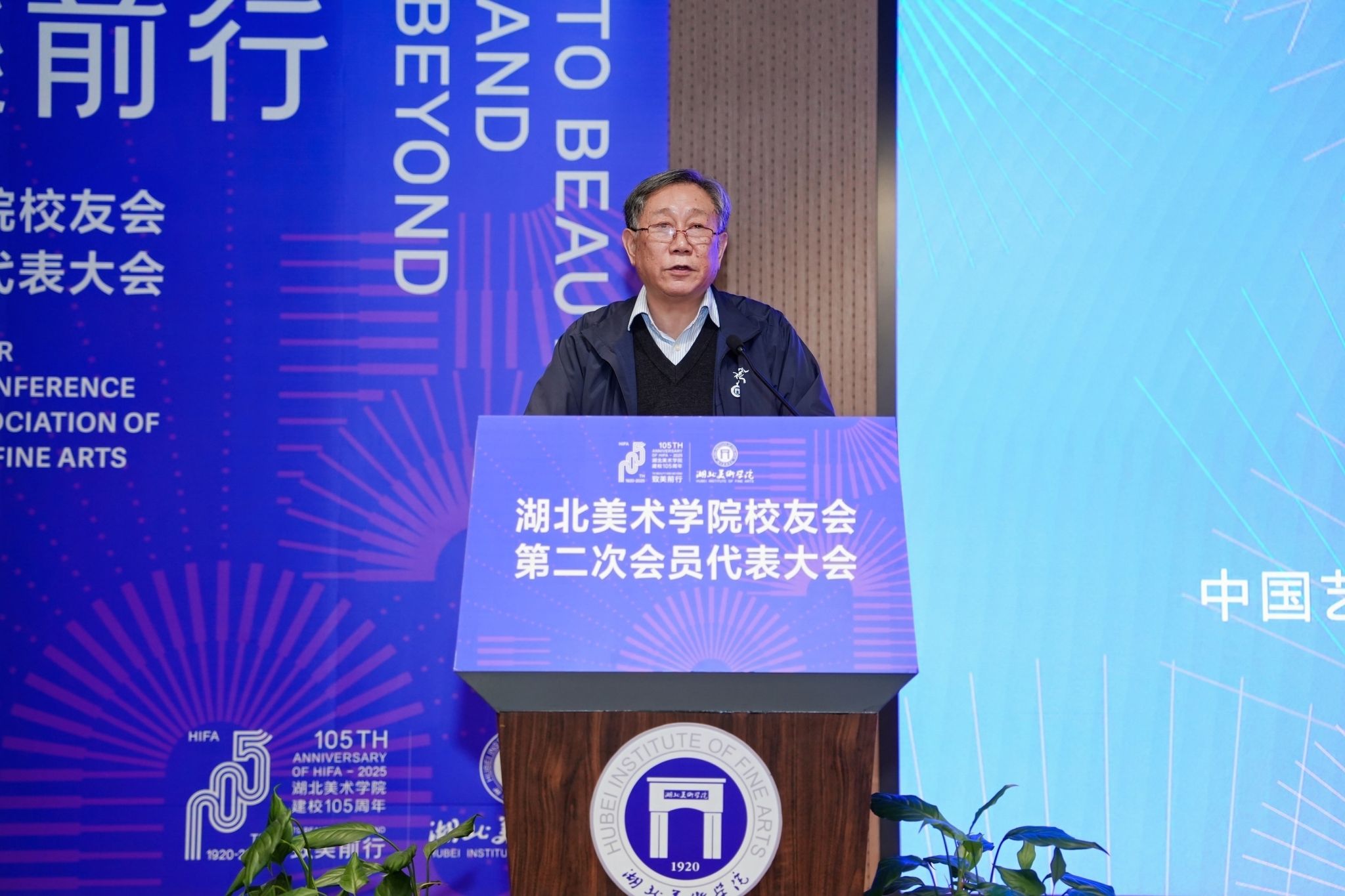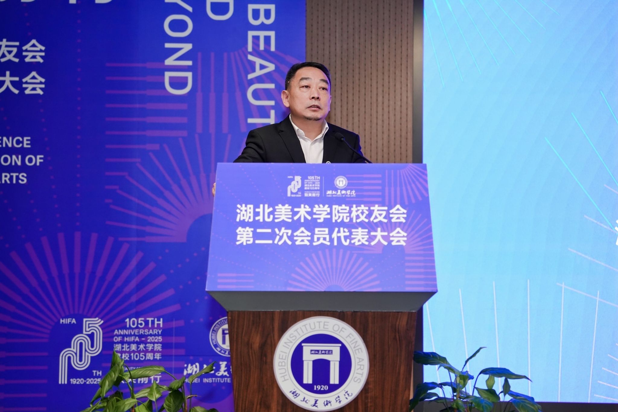 洪勇代表湖北省教育厅向大会的召开表示祝贺,并肯定了湖北美术学院校友会在构建校友工作网络、推动“校友经济”集聚发展的显著成绩。他指出,广大湖美校友以赤子情怀捐资助力母校发展,用艺术才华响应湖北“校友回归”战略,用真情实意助力家乡发展,为湖北支点建设增添了浓墨重彩的艺术印记。他希望新一届校友会进一步完善治理体系,深化校地校友协同,让“校友+”战略释放更大能量。希望广大校友始终心系母校、情牵湖北,在文化传承创新的征程上勇立潮头,共同书写美育赋能高质量发展的新篇章。