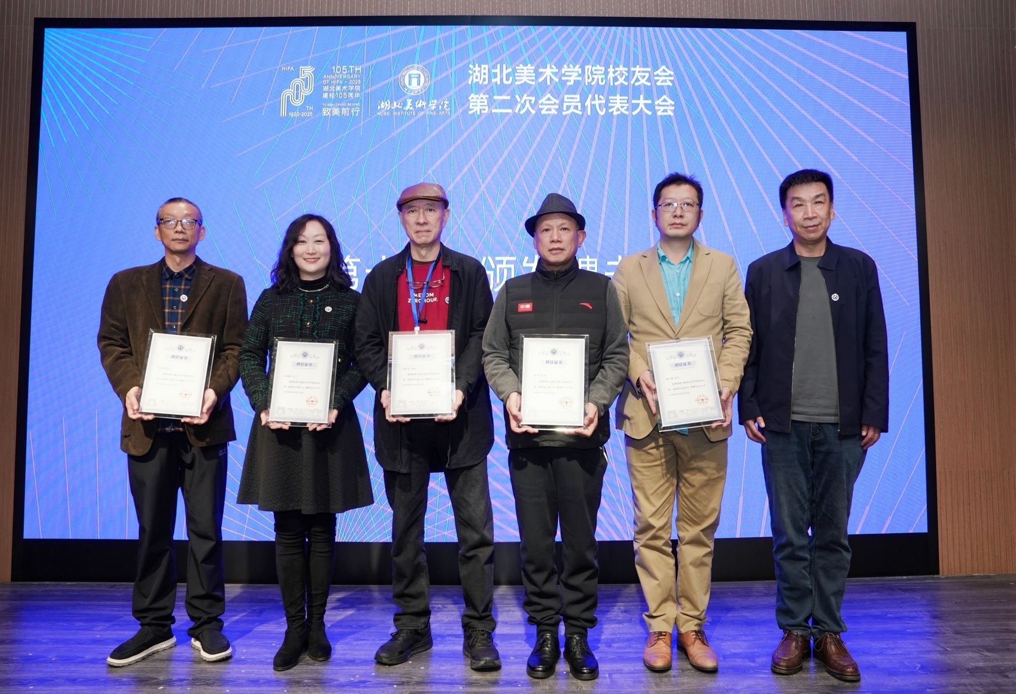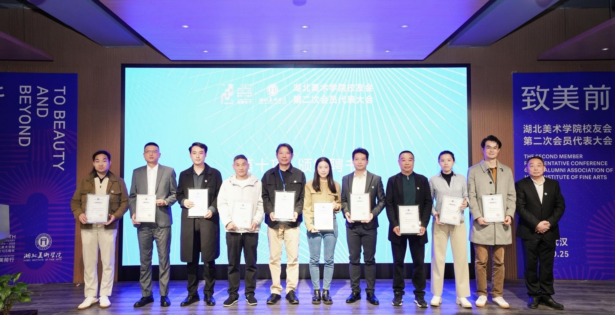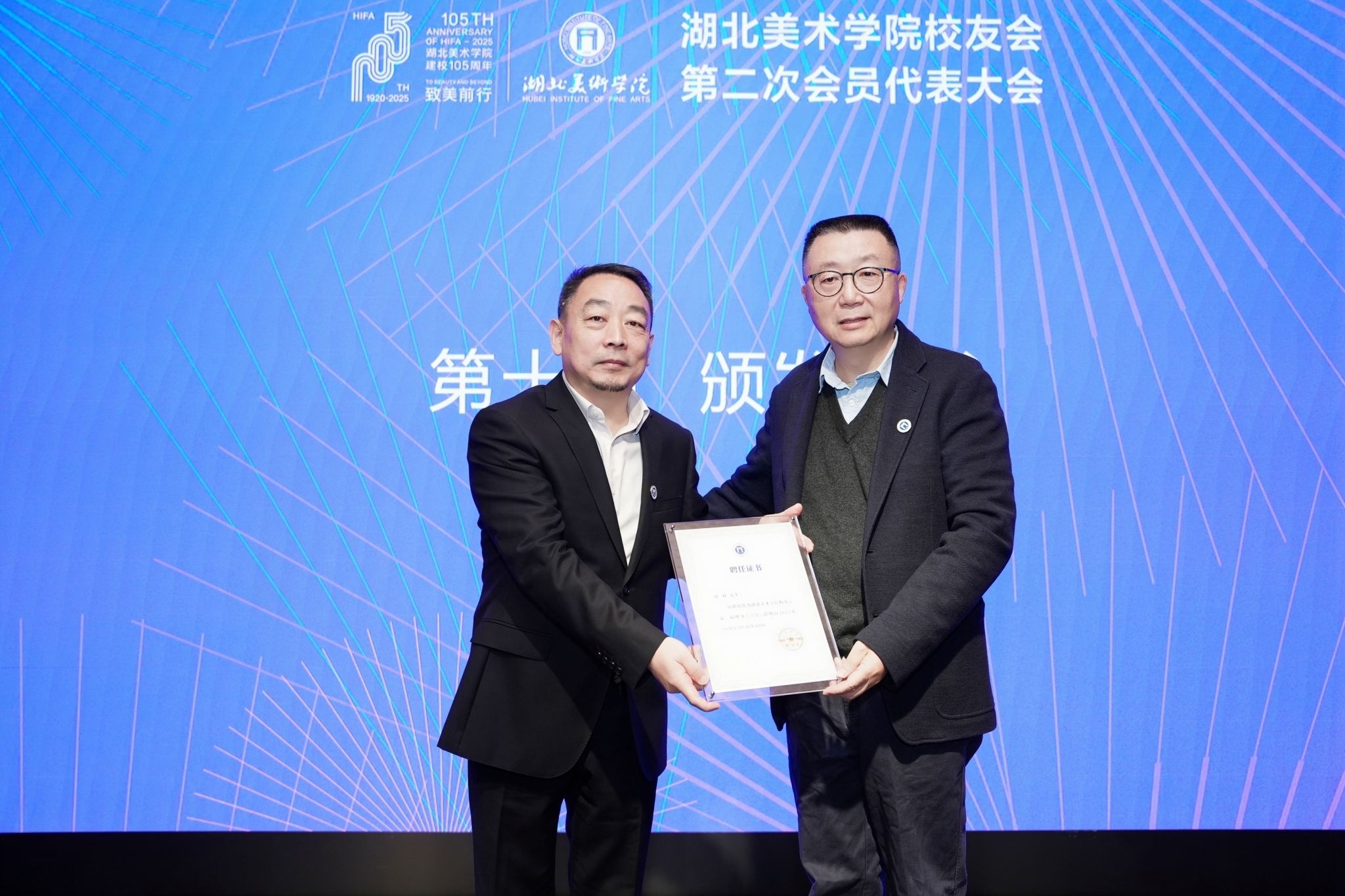 湖北美术学院院长、校友会第二届理事会会长周峰(右一)为新任理事颁发聘书