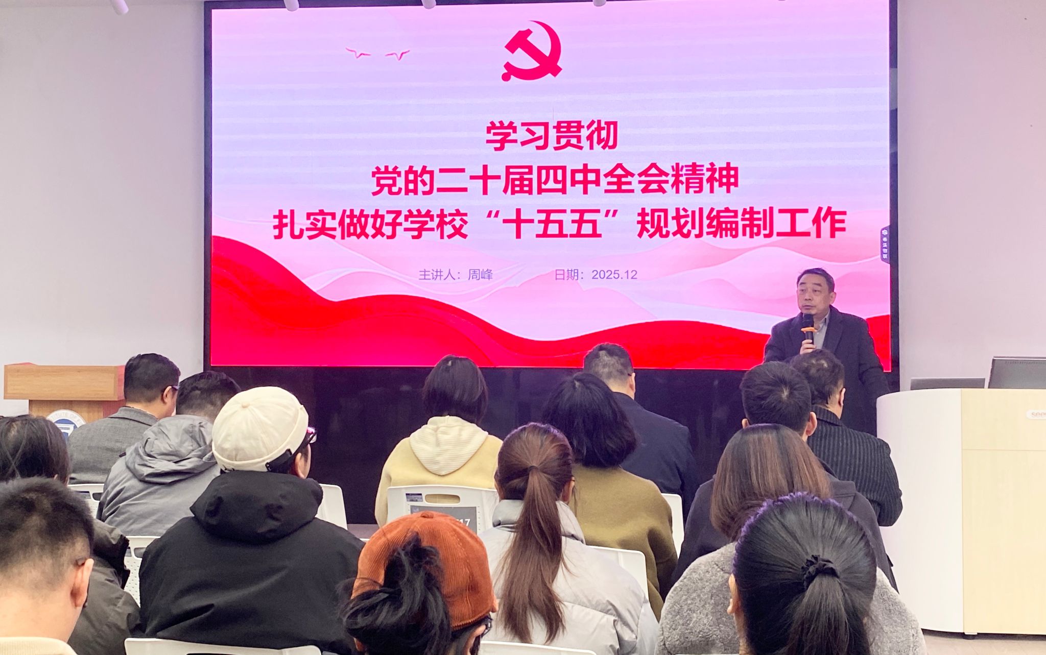 周峰介绍了党的二十届四中全会的时代背景与重大意义,指出全会是在我国全面建设社会主义现代化国家关键时期召开的一次重要会议。他强调,全会审议通过的《中共中央关于制定国民经济和社会发展第十五个五年规划的建议》,为“十五五”乃至更长时期发展指明了方向、提供了根本遵循。在系统解读全会精神时,周峰重点阐述了“十四五”时期国家发展取得的重大成就,剖析了“十五五”时期承前启后的历史方位与战略机遇,并围绕全会确立的六大原则、七大目标及十二方面重点部署,结合教育、科技、文化等领域新要求,进行了深入浅出的阐释。