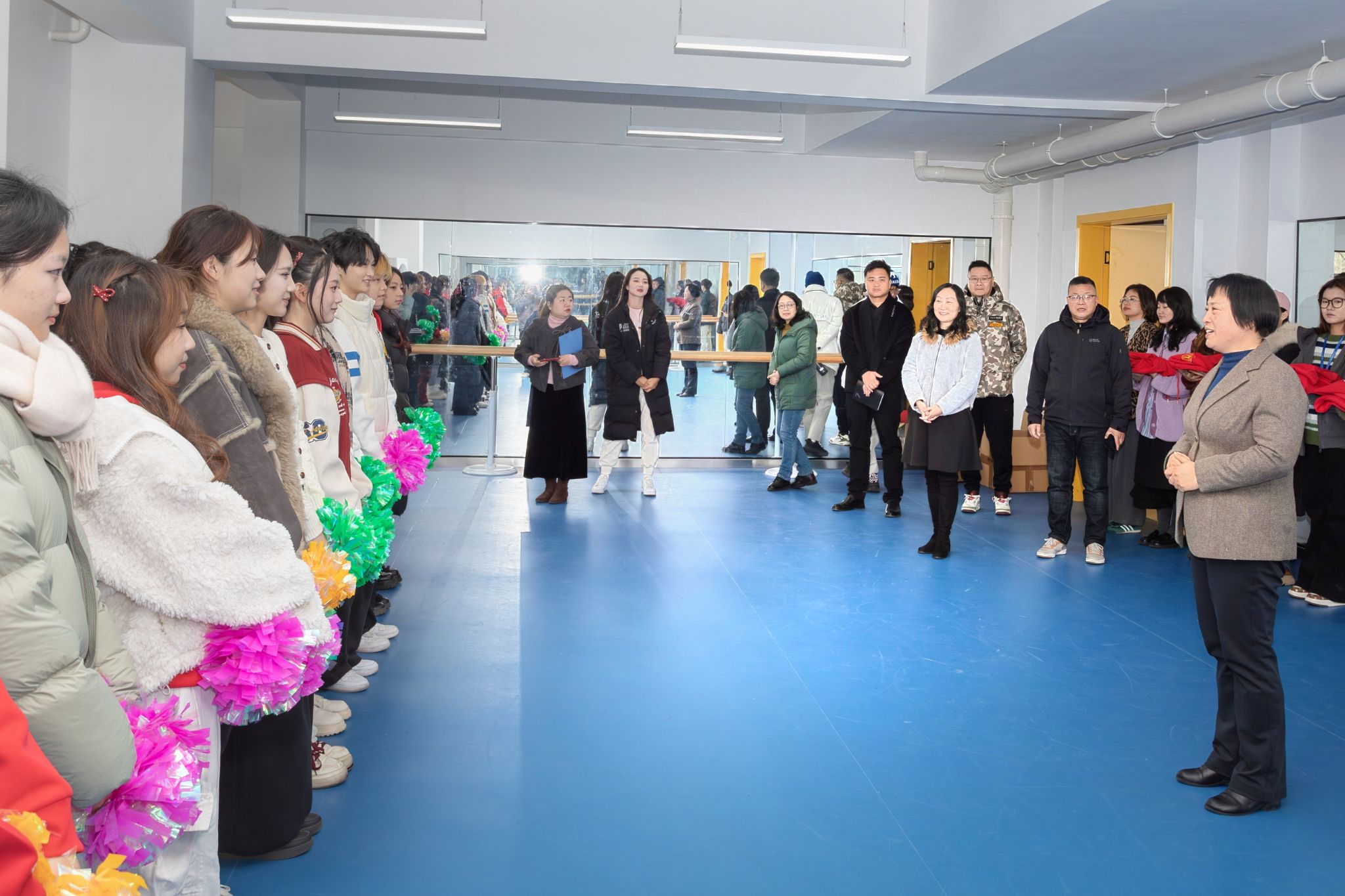 新年将至,岁寒情暖。12月29日中午,校党委书记鲍清芬、校党委副书记朱丽莎带领团委书记刘锟等来到十八栋一楼艺动体育空间的形体房,慰问公共课部黑天鹅啦啦操队队员。公共课部班子成员、黑天鹅啦啦操队领队和教练参加。公共课部主任兼党总支书记周捷峰汇报了近年来加强体育供给侧改革,加强黑天鹅啦啦操队建设所取得的成效。