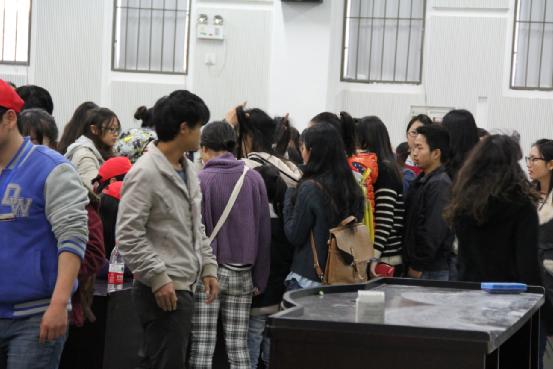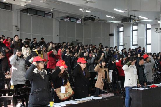 中午12点,中国志愿者注册宣誓大会在A12教学楼115、215教室进行。宣誓大会的工作人员均由青协内部人员担任。工作人员戴好工作牌提前20分钟入场签到。根据之前的工作安排分别在门口迎宾引导入场,到达会场指定位置准备发放证书和登记编号等工作。中午12时注册志愿者的同学有序入场,于各系部指定位置就坐,大会正式开始。