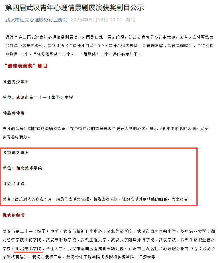 近日,由武汉市精神文明建设办公室、武汉市卫生健康委、湖北省心理学会联合主办的第四届武汉青年心理情景剧展演结果揭晓。我校影视动画学院选送的心理情景剧《旋律之章》从全市各行业团体报送的50多部作品中脱颖而出,荣获“最佳表演奖”,湖北美术学院获“优秀组织奖”。