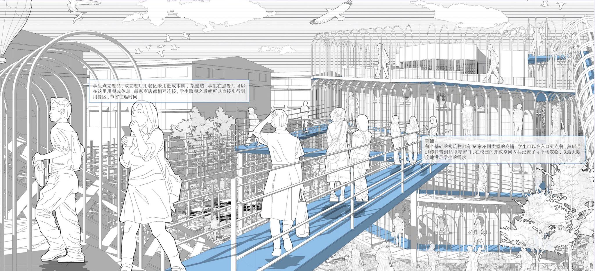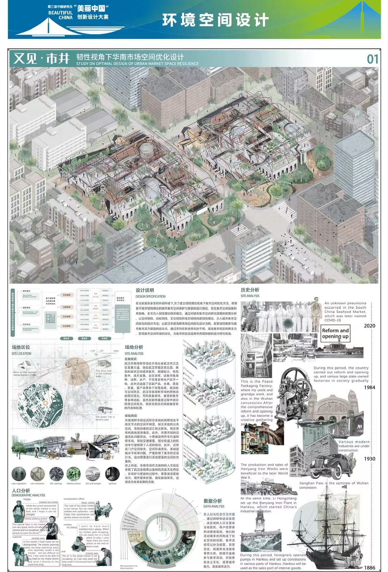 环境艺术学院王心怡、黄梦瑶、魏楚楚的作品《又见市井》荣获环境空间设计赛道二等奖。作品在当前复杂多变的外部环境下,为了建立韧性理论视角下集市空间优化方法,本设计引入韧性理论相关概念,通过对城市集市空间研究进展的梳理分析,以空间韧性、功能韧性、文化韧性和生态韧性构建韧性理论,介入城市集市空间优化的设计方法;以武汉华南海鲜市场空间优化设计为例,探索韧性载体与城市集市活力塑造的结合点,通过系列化和多样化的干预,激发集市街区的再生力,实现集市空间环境的活化,为集市街区改造再利用提供新的设计研究视角。