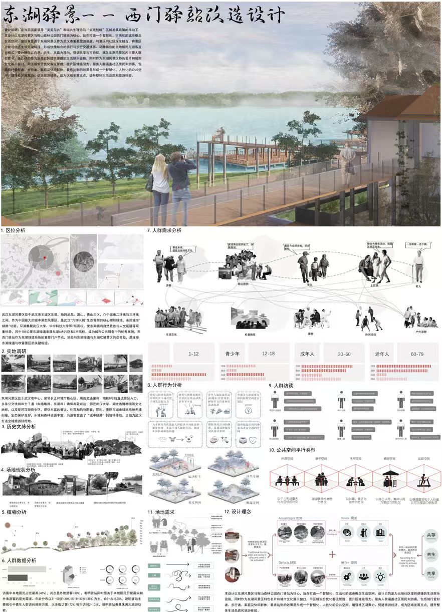 该项目涉及设计学、建筑学、社会学等多个学科交叉,以东湖风景区马鞍山森林公园西门驿站为核心,打造一个智慧化、生活化的城市概念生活空间。东湖风景区作为武汉市重要旅游资源,与景区内社区深度融合,将景区功能与社区生活无缝链接,形成快慢结合的骑行与步行交通体系、动静结合的当地居民与游客互动模式;设计理念以共享、共生、共赢为导向,提升区域吸引力;服务人群涵盖社区居民和游客,包括骑行爱好者、步行者、家庭及休闲群体;最终形成一个智慧化、人性化的公共空间,增强社区凝聚力、促进旅游经济,成为区域发展支点,提升整体生活品质和旅游体验。