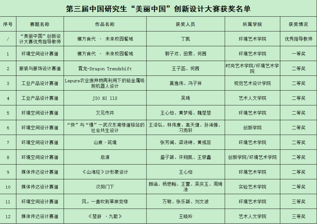 近日,第三届中国研究生“美丽中国”创新设计大赛全国总决赛结果公布。湖北美术学院研究生参赛团队共斩获国赛一等奖1项、二等奖9项、三等奖2项,1位指导教师荣获优秀指导教师奖;学校荣膺优秀组织单位奖。此次研究生师生团队参赛充分展现了学校在研究生培养以赛促教,创新实践改革方面的显著成效。