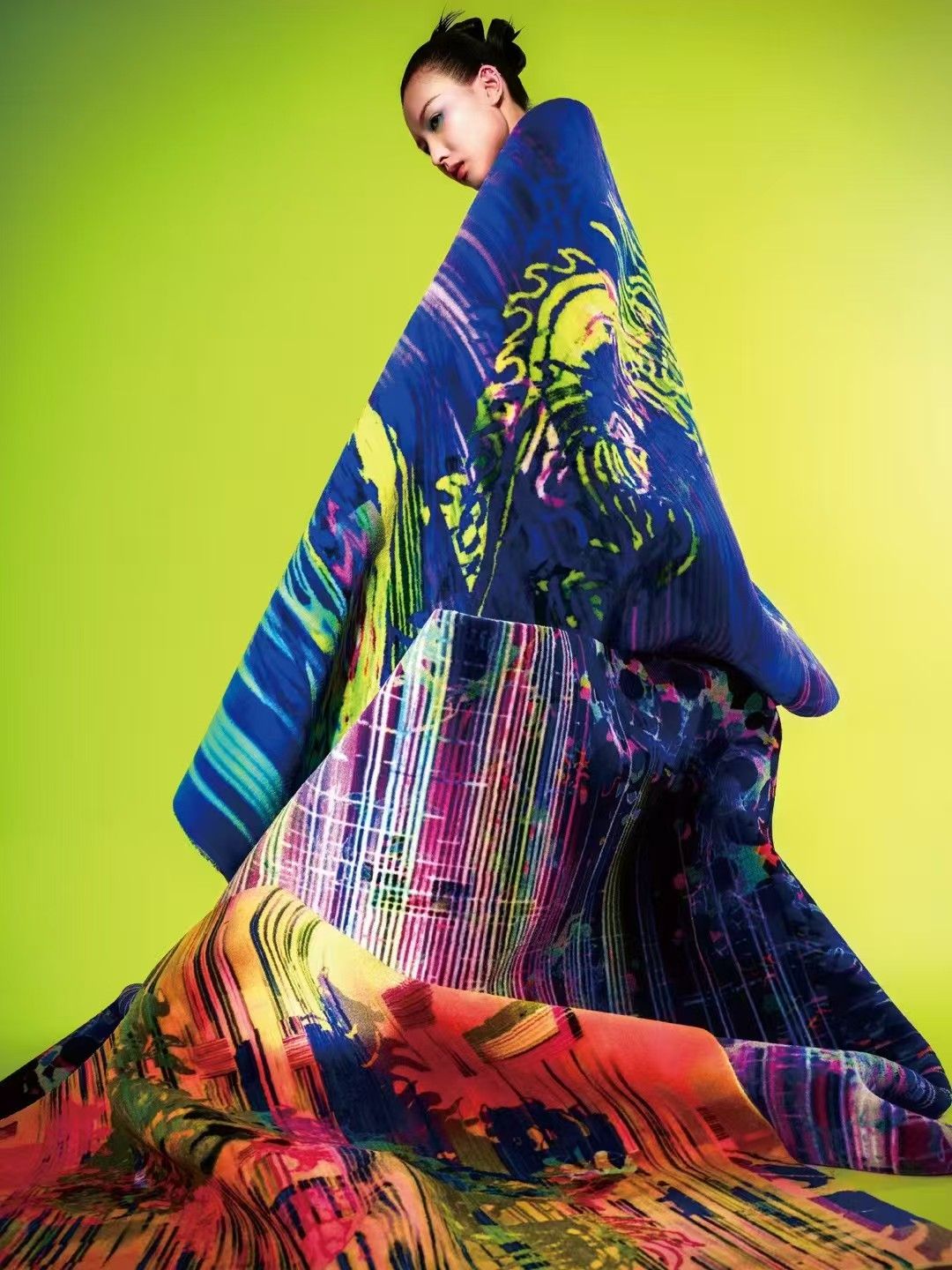 时尚艺术学院/环境艺术学院跨学院研究生团队王子菡 、何茜的作品《霓龙- Dragon Trendshift》荣获服装与服饰设计赛道二等奖。该作品以赛博未来主义碰撞东方美学为核心,融合高饱和霓虹色与汉剧传统色系,形成数字脉冲视觉语言。通过参数化算法解构龙纹、几何拓扑重组龙鳞,结合动态渐变生成赛博龙图腾。创新运用割绒技法与数码提花工艺,植入光学编码逻辑,数控织机调控丝线密度与反光系数造光影梯度。利用数字织造技术制作交互视频,实现传统纹样数字化转译,既保留龙纹祥瑞基因,又赋予数字科技质感,以赛博格美学重构东方文化符号生命力。