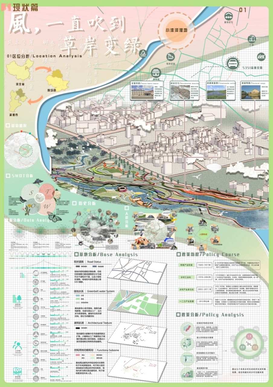 环境艺术学院张乐颖、刘文波、万敬的作品《风,一直吹到草岸变绿》荣获环境空间设计赛道三等奖。该乡村生态湿地景观设计以“生态优先、文化赋能、产业联动”为核心原则,旨在打破传统湿地规划仅聚焦生态保护的单一维度,实现“环境资源—景观营造—特色产业”的深度耦合。场地规划充分依托乡村原生湿地生态基底,既保留湿地调蓄水源、净化环境的生态功能,又通过景观化设计激活其文旅价值,最终将场地打造为“可观赏、可体验、可记忆”的特色湿地文化打卡点,让生态优势转化为乡村发展的内生动力。不仅致力于构建“文化特色地标、生态风景名片”,更希望以“风”为喻—— 让生态保护的“清风”吹绿乡村草原,让文化传承的“暖风”浸润游客心灵。