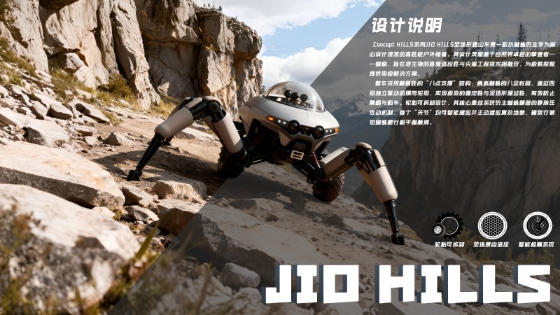 艺术人文学院吴琦的作品《JIO HILLS》:Concept HILLS系列JIO HILLS全地形登山车是一款以蜘蛛仿生学为核心设计理念的高性能户外装备。其设计灵感源于自然界卓越的攀登者一一蜘蛛,旨将生物的高度适应性与尖端工程技术相融合,为极限探险提供解决方案。整车采用颠覆性的“八点支撑”结构,模拟蜘蛛的八足布局 通过四组独立驱动的履带轮组,实现极致的稳定性与全地形通过性,有效防止侧翻与陷车。轮胎可拆卸设计,其核心悬挂 统仿生蜘蛛腿部的静液压传动机制,每个“关节”均可智能感应并主动适应复杂地貌,确保行驶如蜘蛛爬行船平稳顺滑。