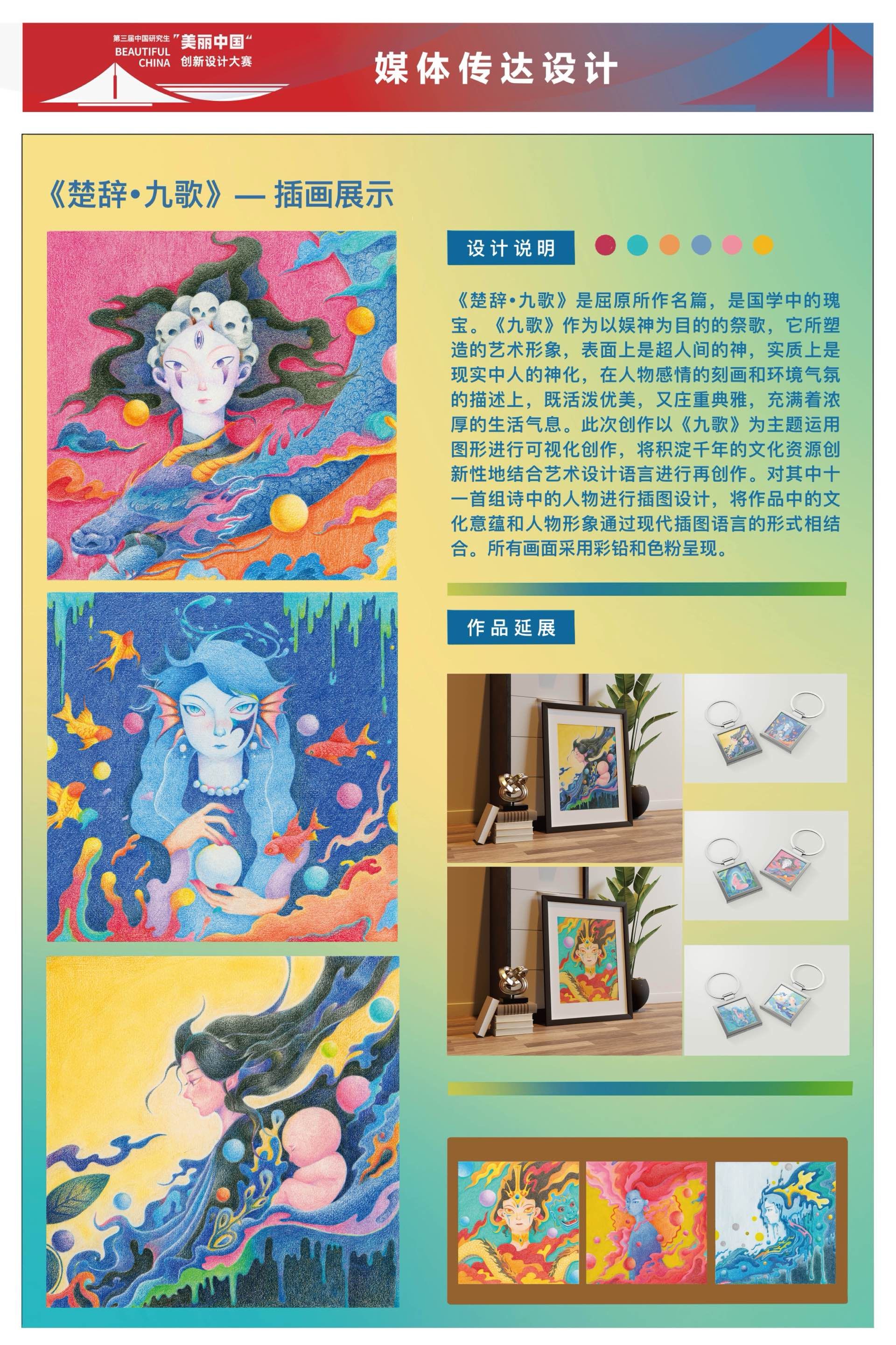 艺术人文学院王晓玲同学的作品《楚辞・九歌》荣获媒体传达设计赛道三等奖。其将古典文学与现代视觉传达设计相融合。《楚辞·九歌》是屈原所作名篇,是国学中的瑰宝。此次创作以《九歌》为主题运用图形进行可视化创作,将积淀千年的文化资源创新性地结合艺术设计语言进行再创作。对其中十一首组诗中的人物进行插图设计,将作品中的文化意蕴和人物形象通过现代插图语言的形式相结合。所有画面均采用彩铅和色粉呈现。
