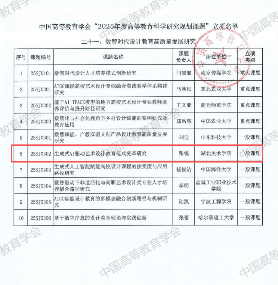 近日,中国高等教育学会公示了“2025年度高等教育科学研究规划课题”立项课题,由湖北美术学院工业设计学院副院长张锐牵头,与校内外专家团队共同申报的课题《生成式AI驱动艺术设计教育范式变革研究》获批立项为数智时代设计教育高质量发展研究一般课题。