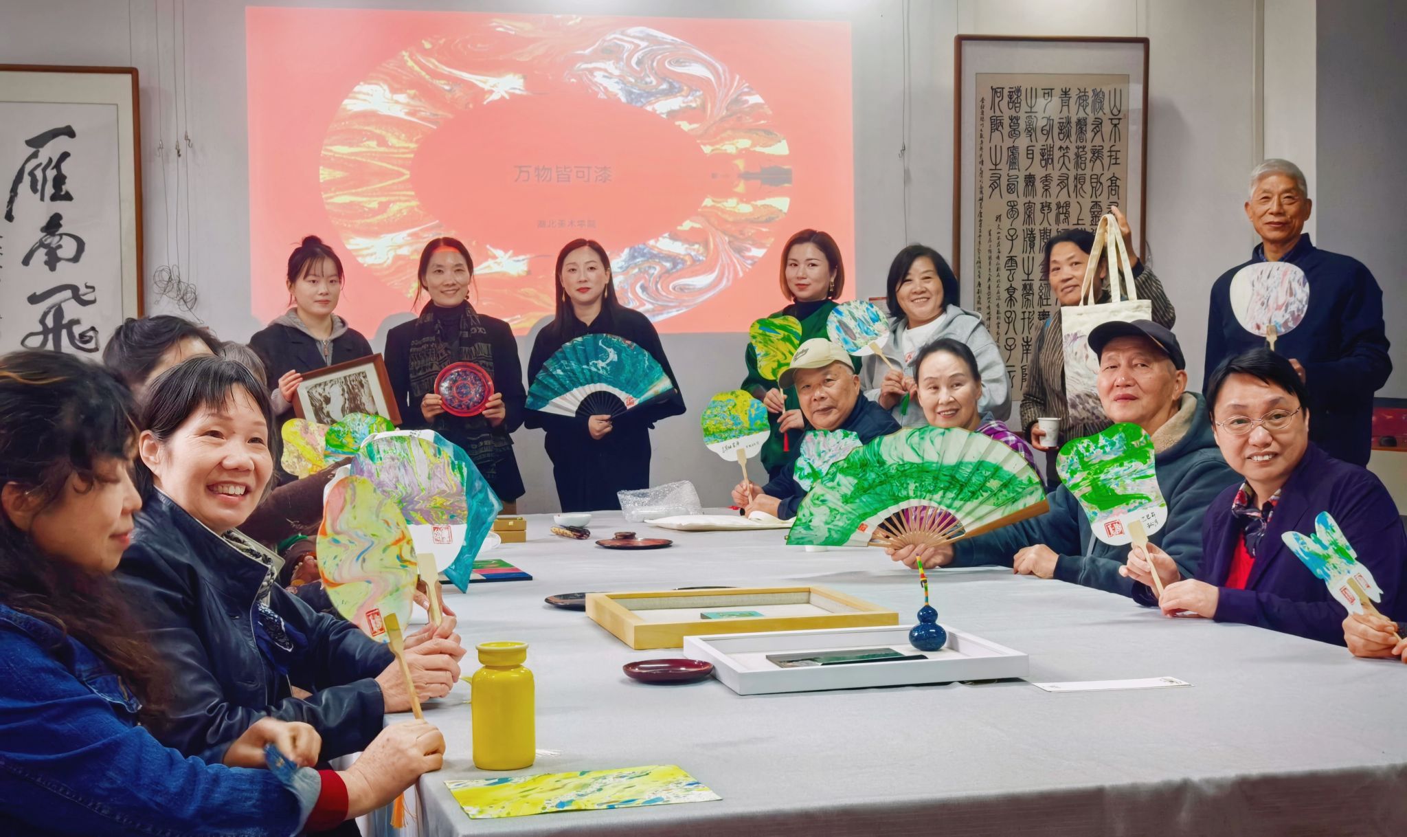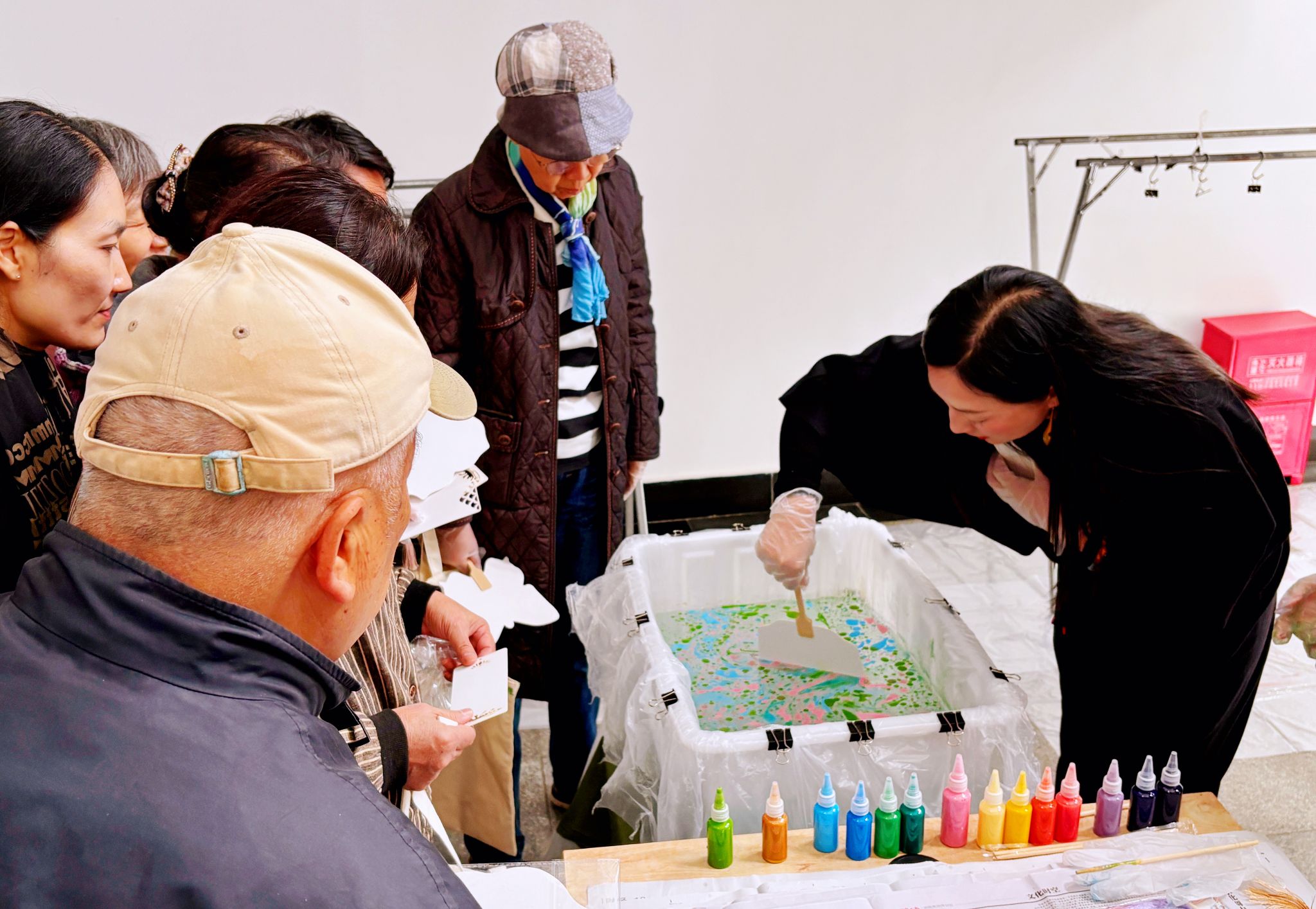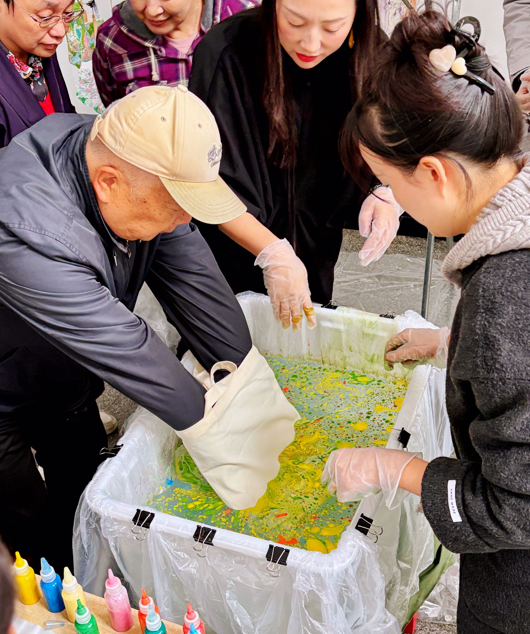 在实践环节,老同志们展现出浓厚的兴趣与高涨的热情。在助教和工作人员的悉心协助下,大家挑选心仪的色彩,将稀释后的环保漆料依次滴入水中,轻轻拨动水面,观察色漆在水面自然交融、扩散,形成如梦似幻的纹理。随后,他们将准备好的书签、扇面、布袋等素胚材料小心翼翼浸入水中,转瞬间,一幅幅独一无二、色彩斑斓的漂漆作品便跃然其上。活动现场气氛温馨而热烈,老同志们相互交流创作心得,欣赏彼此的作品,脸上洋溢着如孩童般纯真的笑容与成就感。