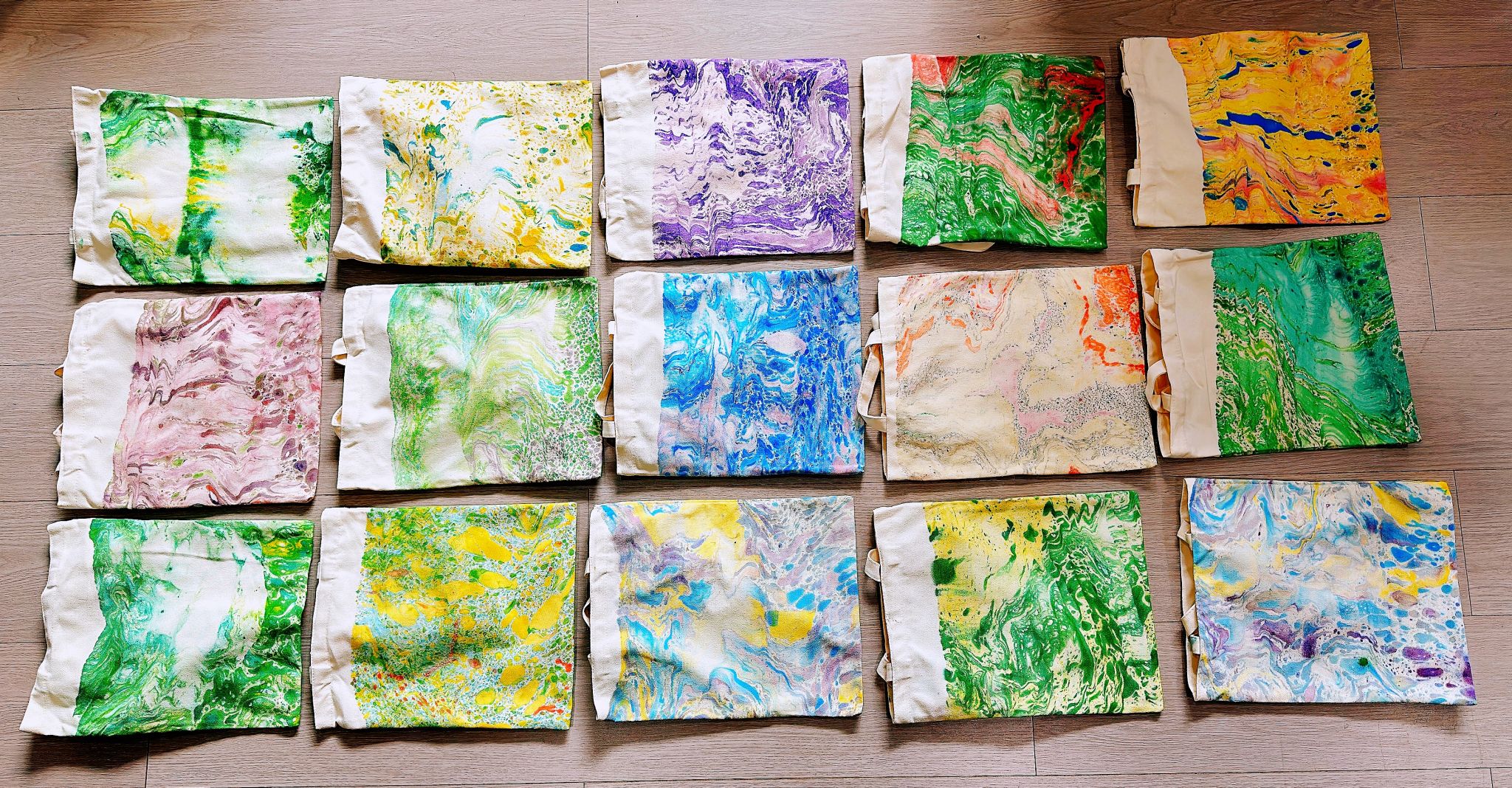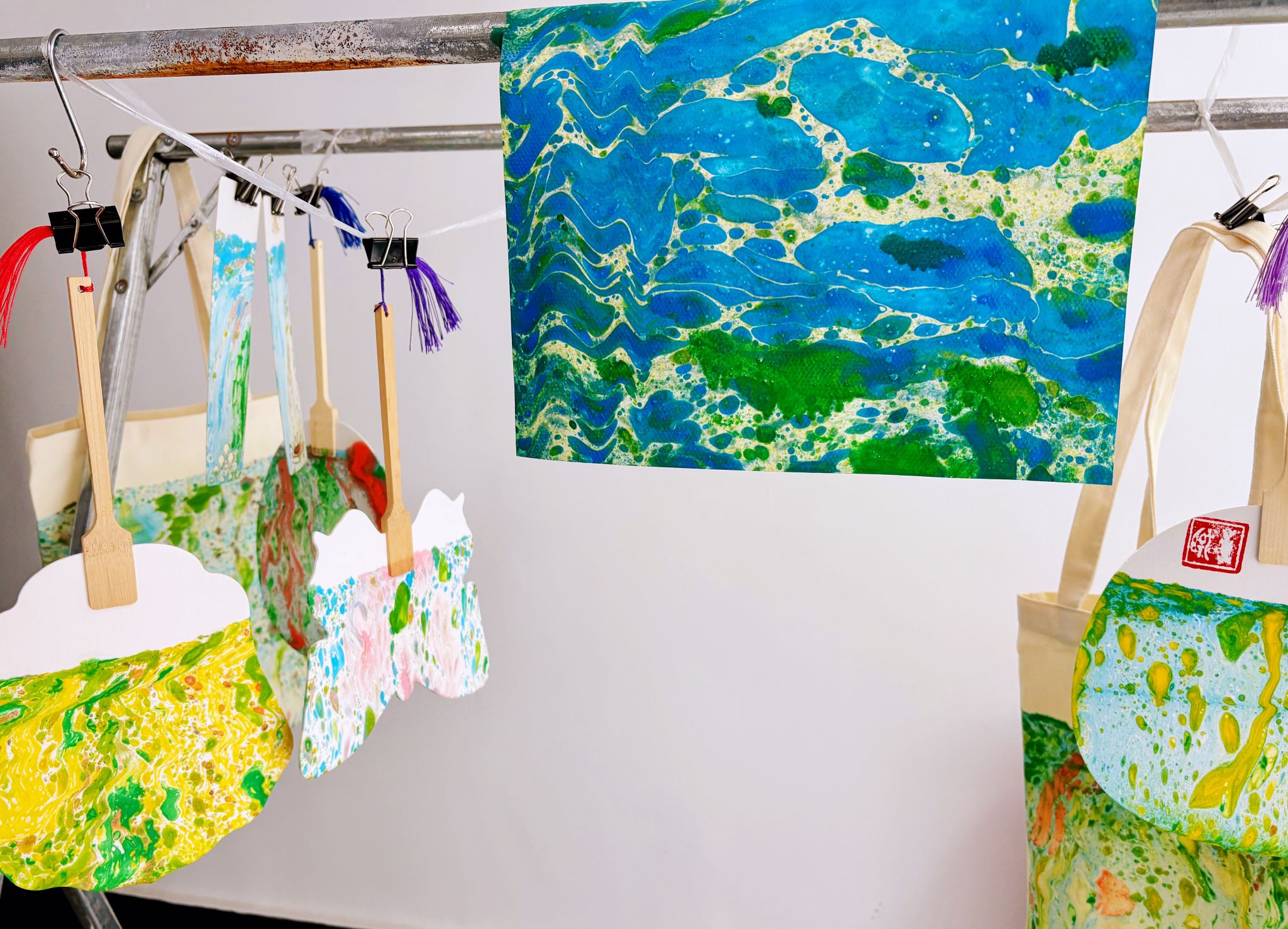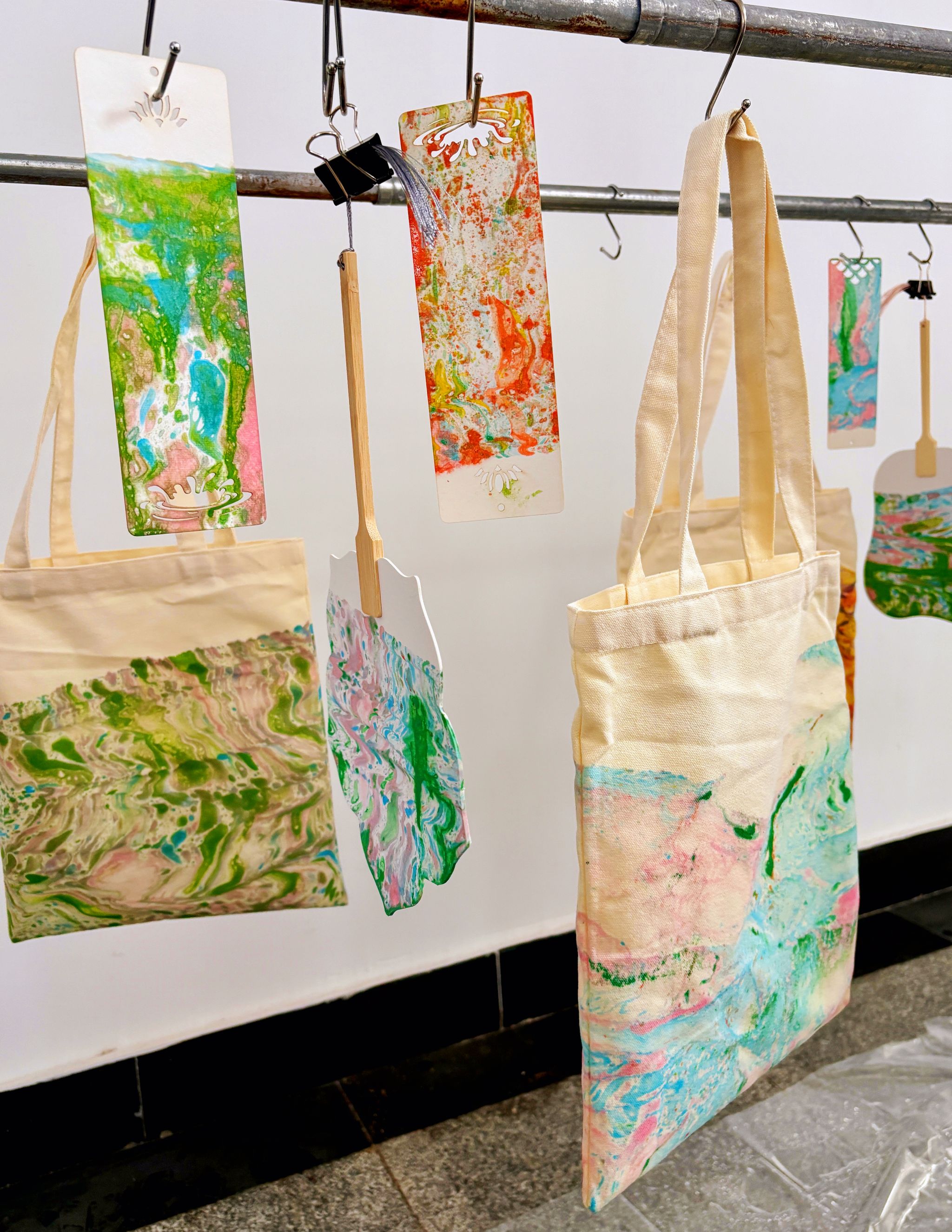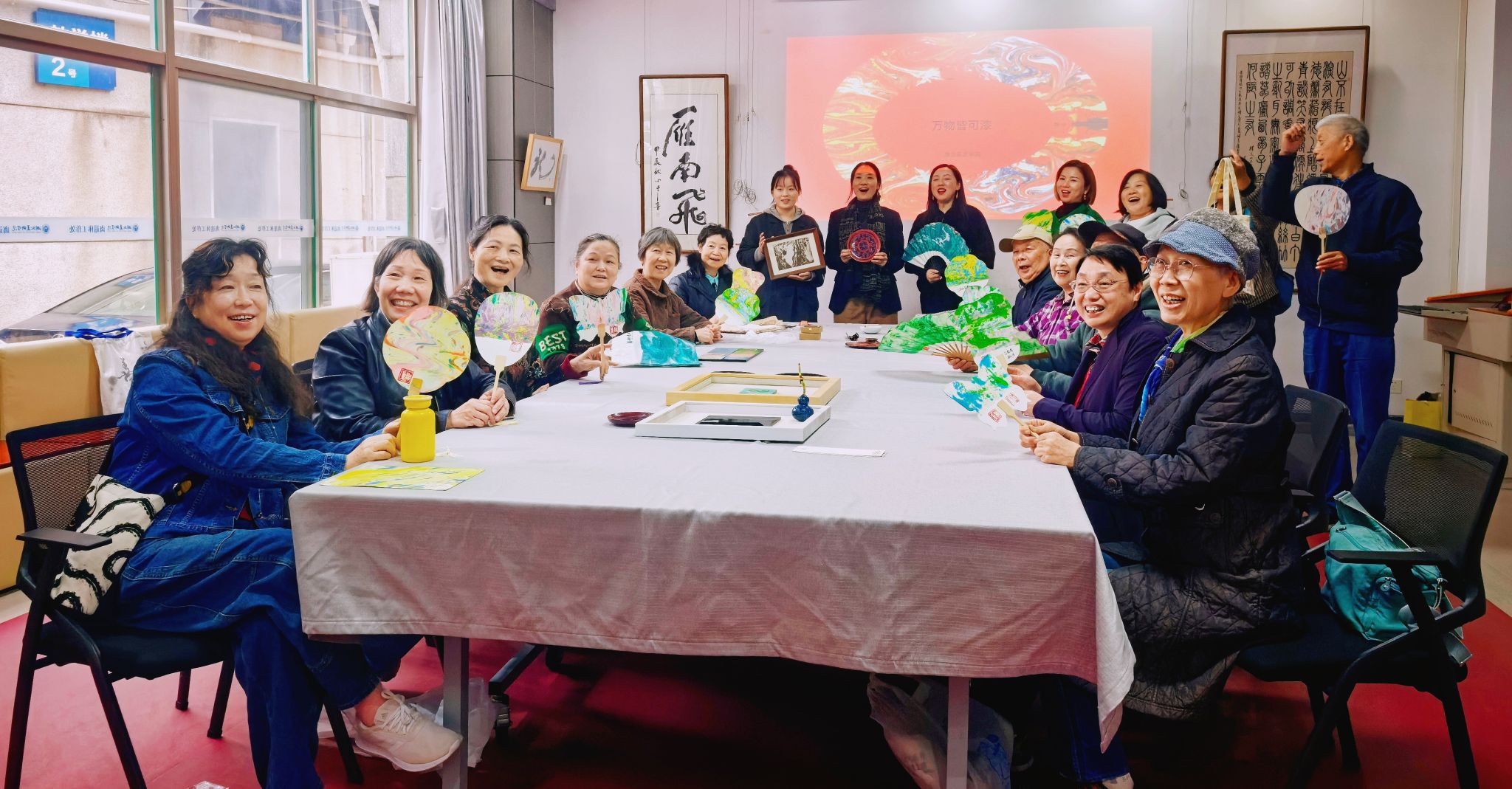 在实践环节,老同志们展现出浓厚的兴趣与高涨的热情。在助教和工作人员的悉心协助下,大家挑选心仪的色彩,将稀释后的环保漆料依次滴入水中,轻轻拨动水面,观察色漆在水面自然交融、扩散,形成如梦似幻的纹理。随后,他们将准备好的书签、扇面、布袋等素胚材料小心翼翼浸入水中,转瞬间,一幅幅独一无二、色彩斑斓的漂漆作品便跃然其上。活动现场气氛温馨而热烈,老同志们相互交流创作心得,欣赏彼此的作品,脸上洋溢着如孩童般纯真的笑容与成就感。