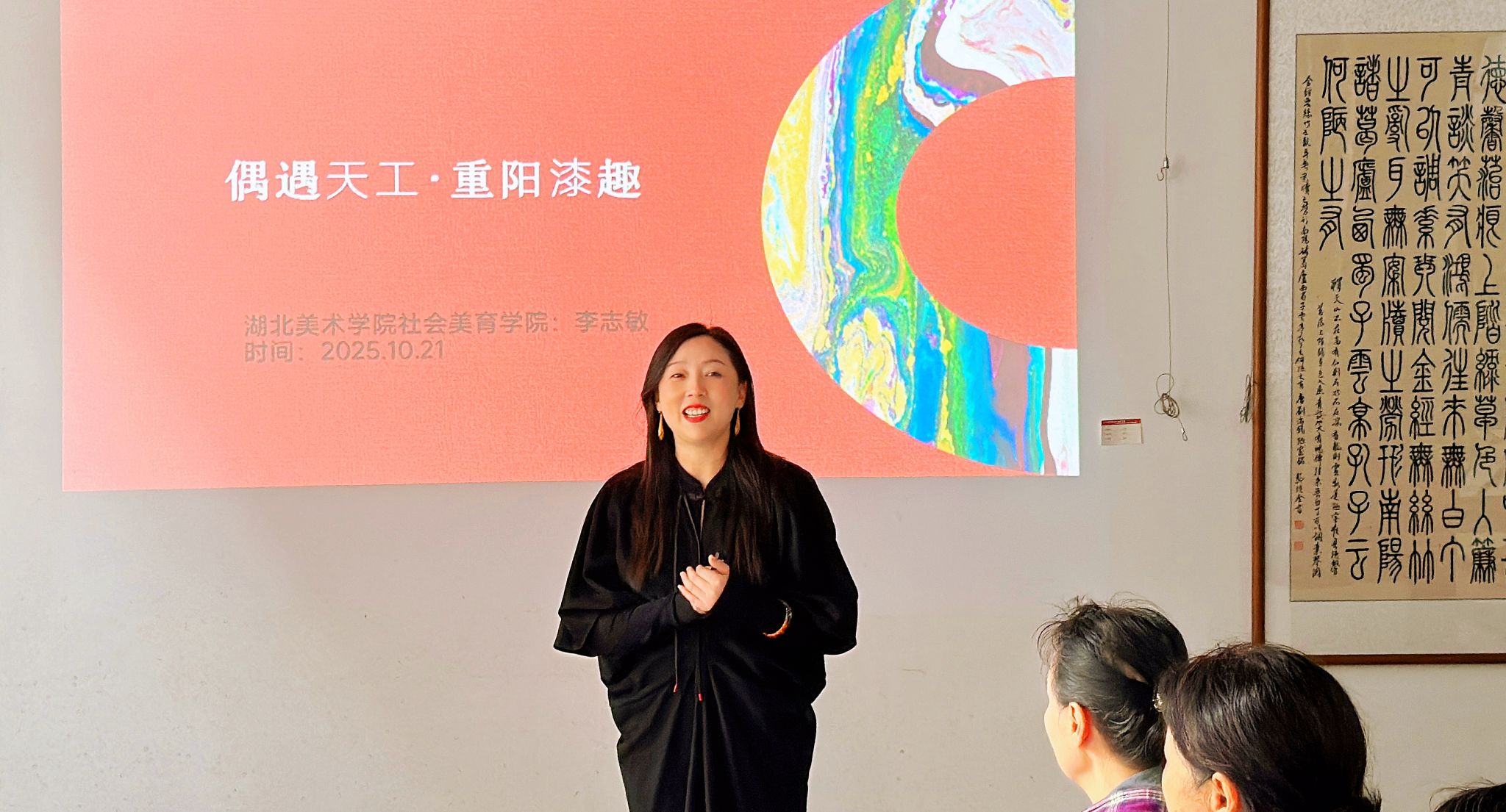 本次体验活动特邀湖北美术学院社会美育学院李志敏老师及其团队进行现场指导。李老师简要介绍了漂漆艺术的历史渊源、工艺特点及其作为非物质文化遗产的价值。漂漆,以其独特的流动性与不可复制的肌理效果,在水面勾勒出变幻无穷、瑰丽莫测的图案,恰如晚年生活般可以拥有从容而绚烂的笔墨。