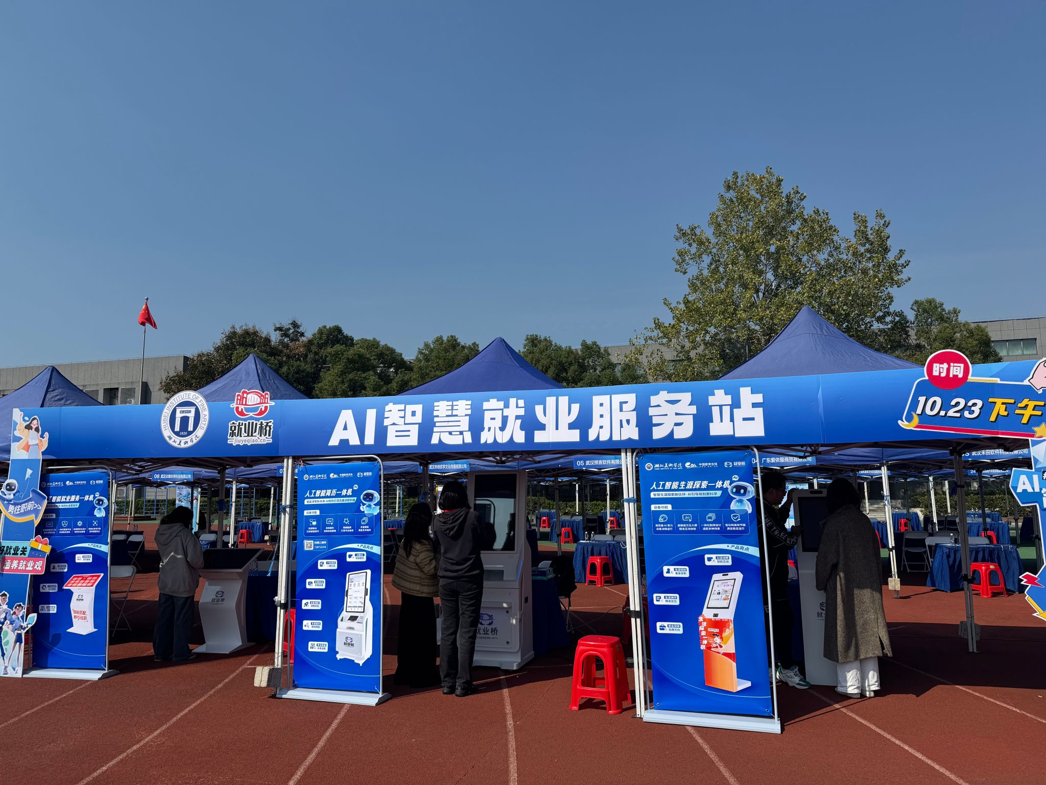 10月23日下午,湖北美术学院2026届毕业生秋季招聘会在藏龙岛校区学生运动场顺利举办。党委常委、纪委书记、监察专员张以林,党委常委、副校长曹丹深入招聘会现场指导工作,招生就业处及各教学单位负责人参与,并与用人单位进行了深入交流。