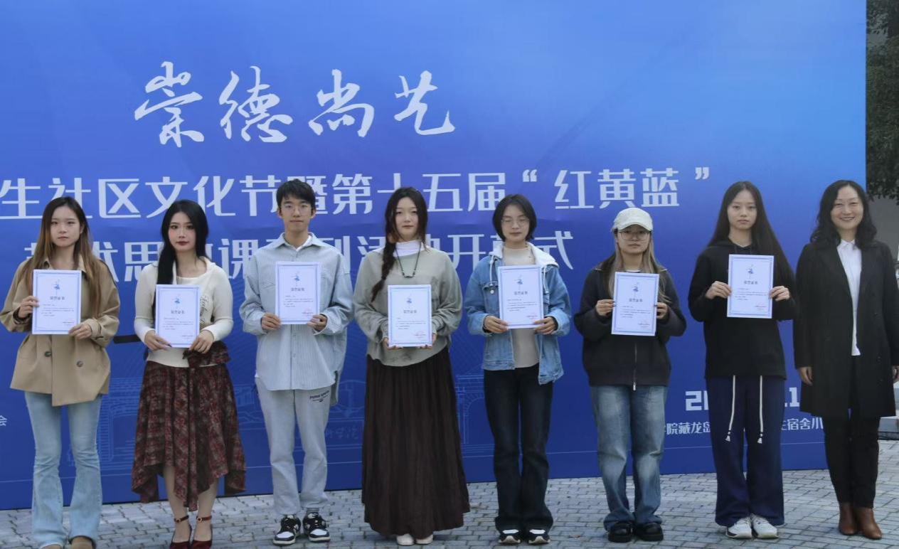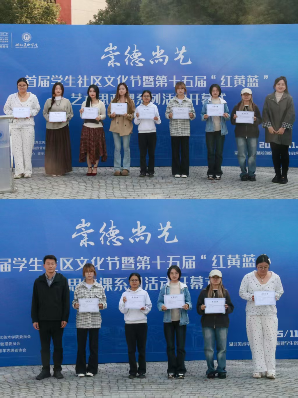 校党委副书记朱丽莎,学生工作部副部长李孟丹、张波分别为十四届“红黄蓝”艺术思政课获奖集体和个人颁发荣誉证书,以表彰同学们在校园文化建设和艺术实践中的积极贡献。