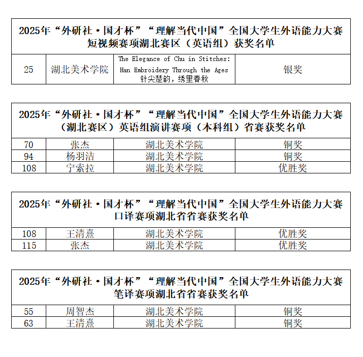 近日,2025“外研社·国才杯”“理解当代中国”全国大学生外语能力大赛四项赛事的湖北省赛落幕,公共课部外语教研室积极组织本科生、研究生参赛,荣获省级银奖1项、铜奖4项、优胜奖3项。