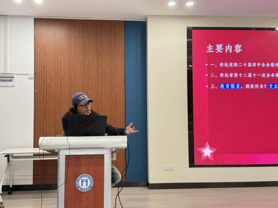 郝孝飞对党的二十届四中全会精神和省委十二届十一次全会精神进行了系统解读,并结合自身在学校25年的教学工作经验,围绕“教育强省,湖美何为?支点建设,湖美何为。”展开授课内容。