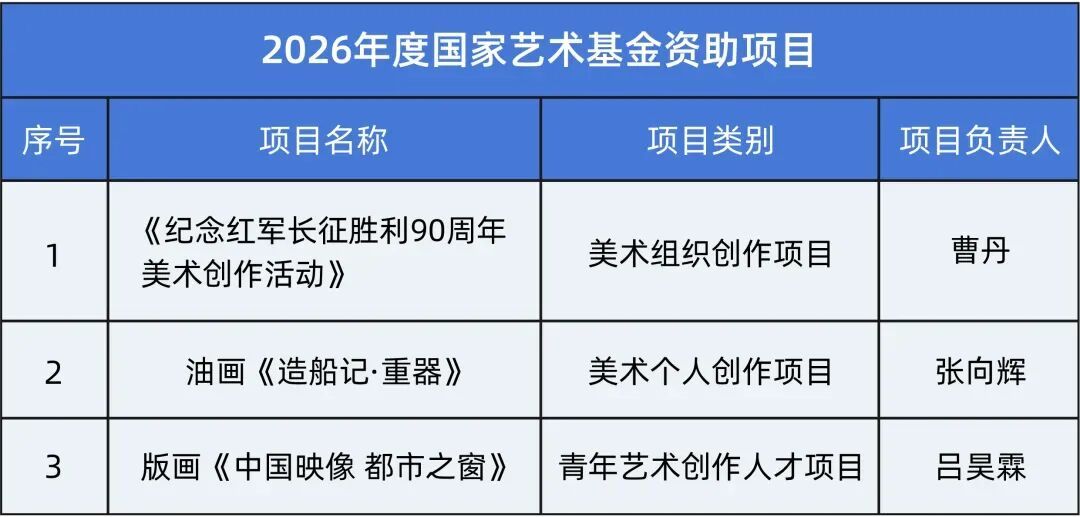 2025年12月2日,国家艺术基金管理中心公示了国家艺术基金2026年度资助项目立项名单。 在此次申报中,绘画学院共有3个项目获批立项,包括美术组织创作1项、美术个人创作项目1项、青年艺术创作人才项目1项,展现出绘画学院在主题创作、个人艺术探索与青年人才培养方面的成效。