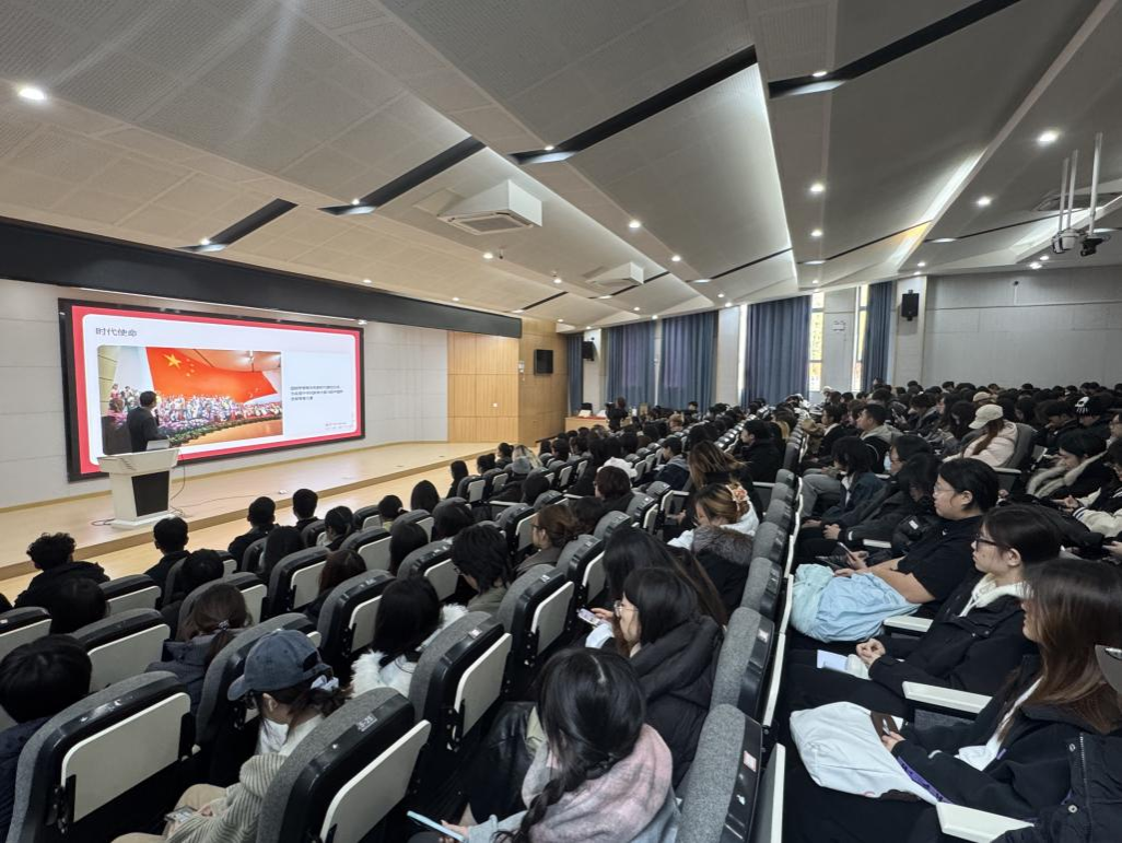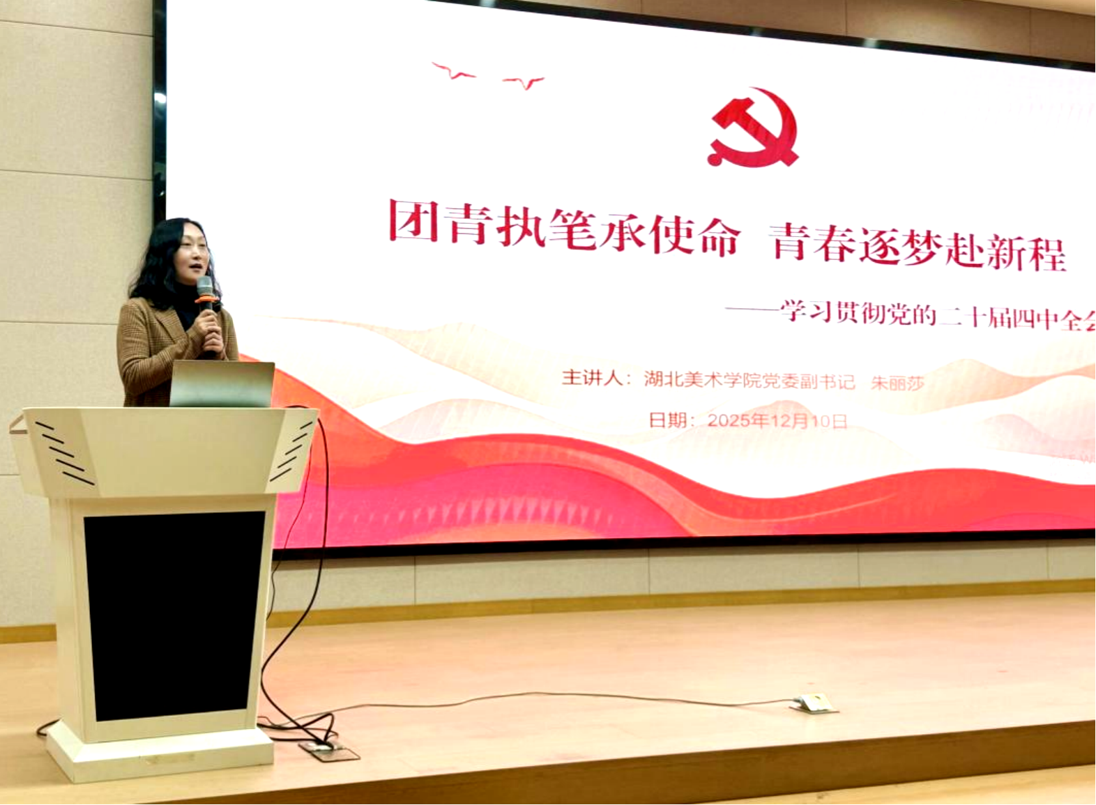 12月10日下午,湖北美术学院2025年新团员入团仪式在A12-115举行。校党委副书记朱丽莎出席仪式并以《团青执笔承使命 青春逐梦赴新程》为主题,向全体新团员宣讲党的二十届四中全会精神。党委学生工作部、团委相关负责人及工作人员,各二级学院团委书记与300余名新团员共同聆听宣讲报告。