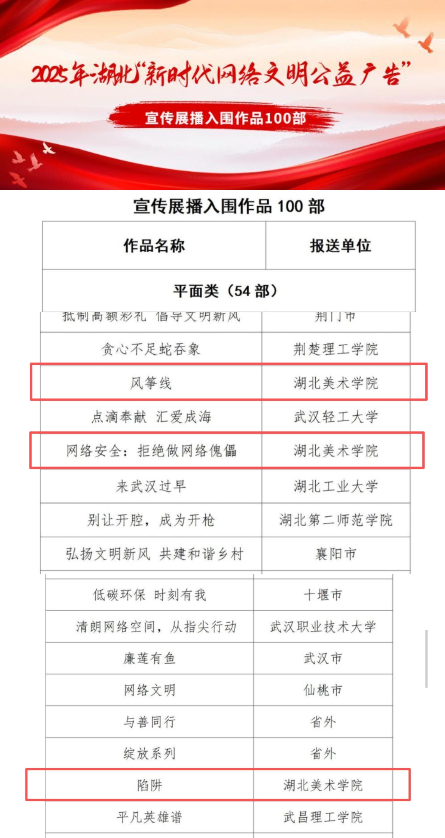 近日,2025年湖北省“新时代网络文明公益广告”优秀作品评选结果揭晓,我校视觉艺术设计学院多幅学生作品凭借鲜明的主题、专业的表达和积极的价值观导向,在众多参赛作品中脱颖而出。