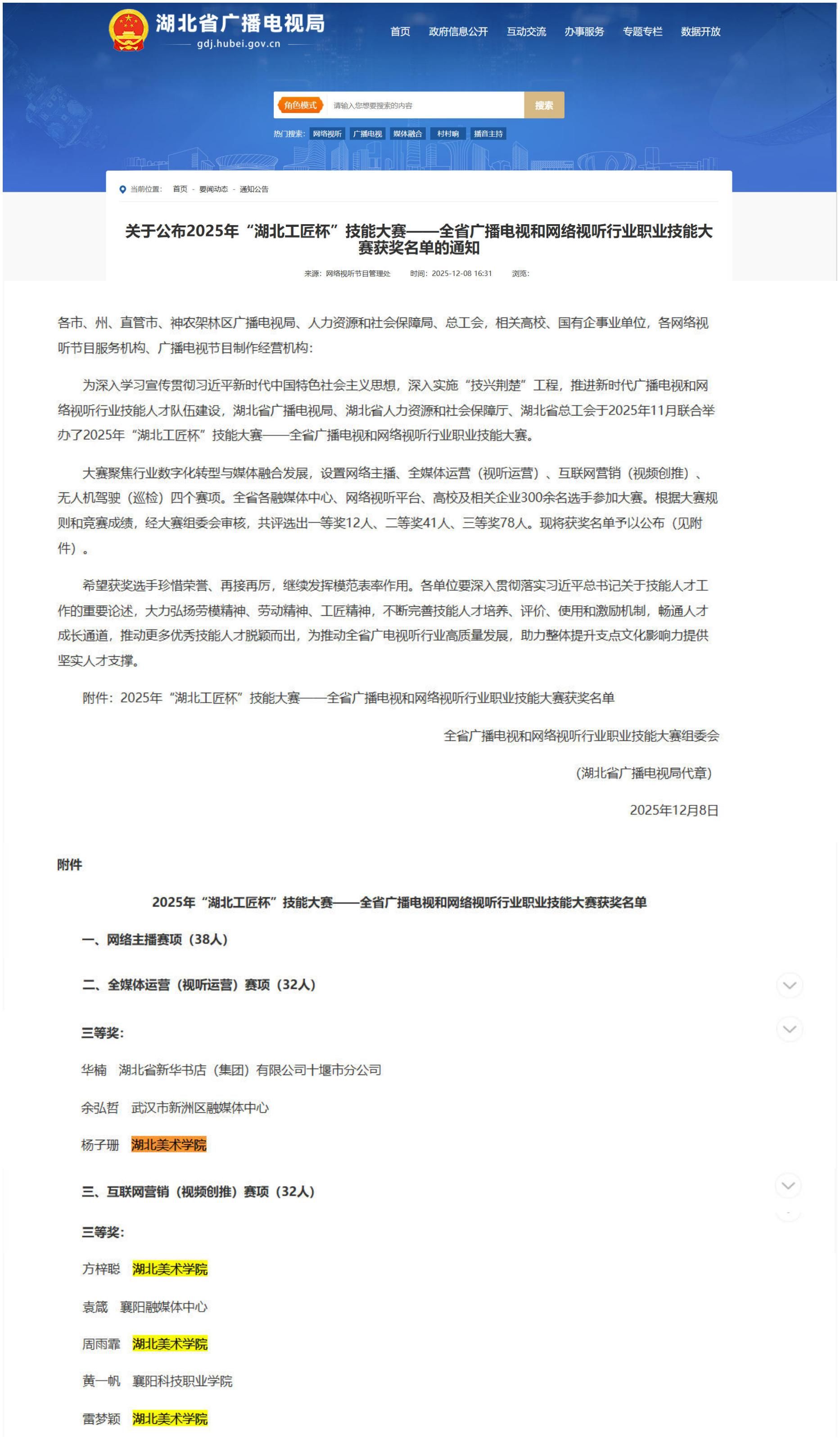 近日,2025年“湖北工匠杯”技能大赛——全省广播电视和网络视听行业职业技能大赛圆满落幕。我校影视动画学院高度重视此次赛事,精心组织筹备,由辅导员带队参赛,学子们凭借扎实的专业功底与创新实践能力获得4项三等奖,充分展现学院人才培养成果。