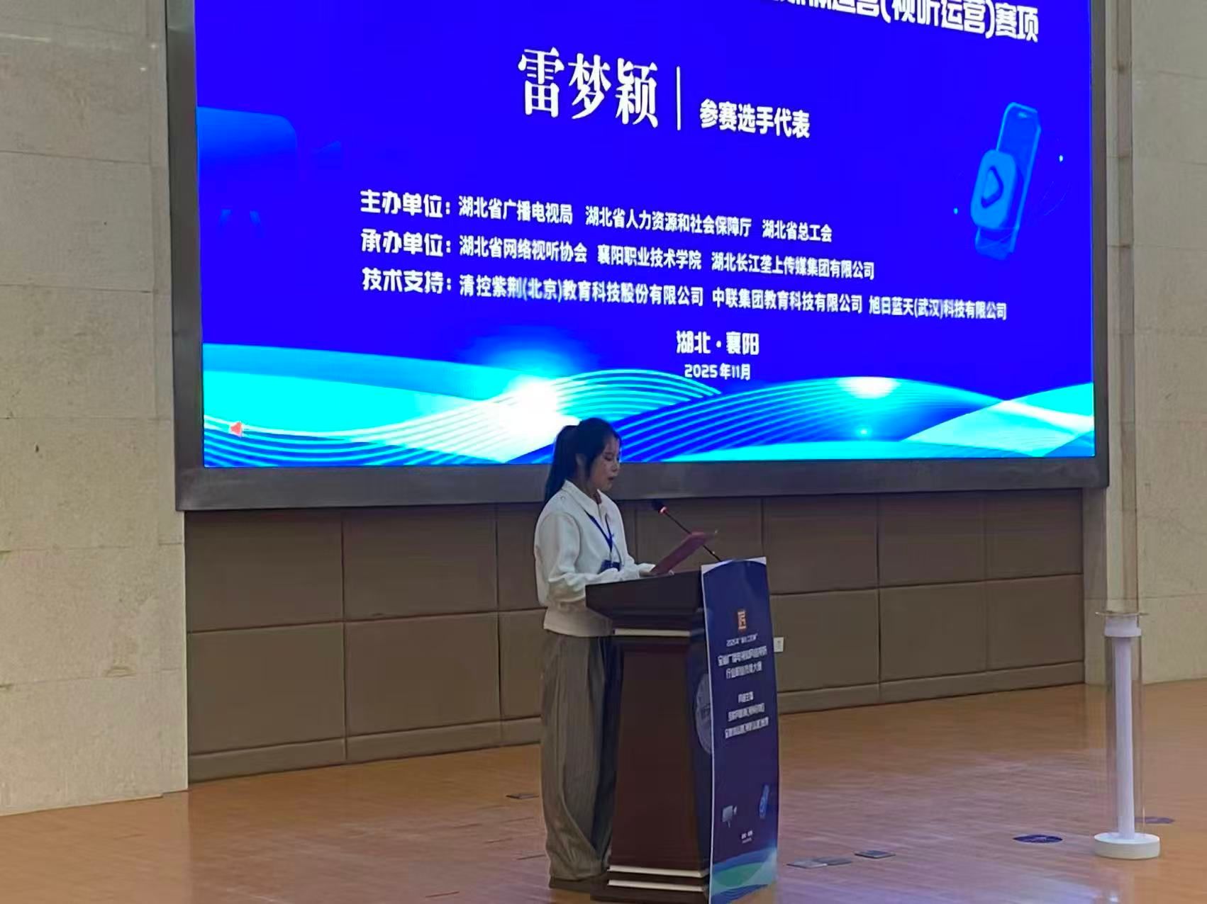 本次大赛由湖北省广播电视局、湖北省人力资源和社会保障厅、湖北省总工会联合主办,湖北省网络视听协会、襄阳职业技术学院等单位承办,是全省广播电视和网络视听行业规格较高的技能赛事。大赛聚焦行业数字化转型与媒体融合发展趋势,设置网络主播、全媒体运营(视听运营)、互联网营销(视频创推)、无人机驾驶(巡检)四个赛项,吸引了全省各融媒体中心、网络视听平台、高校及相关企业300余名选手同台竞技。经过激烈角逐,组委会最终评选出一等奖12人、二等奖41人、三等奖78人。在大赛开幕式上,影视动画学院2024级戏美专业雷梦颖作为赛事代表登台发言,以青春视角分享对行业发展与技能提升的见解,展现了湖美学子的专业素养与精神风貌。