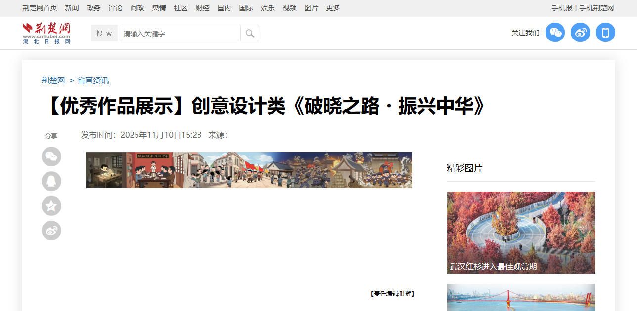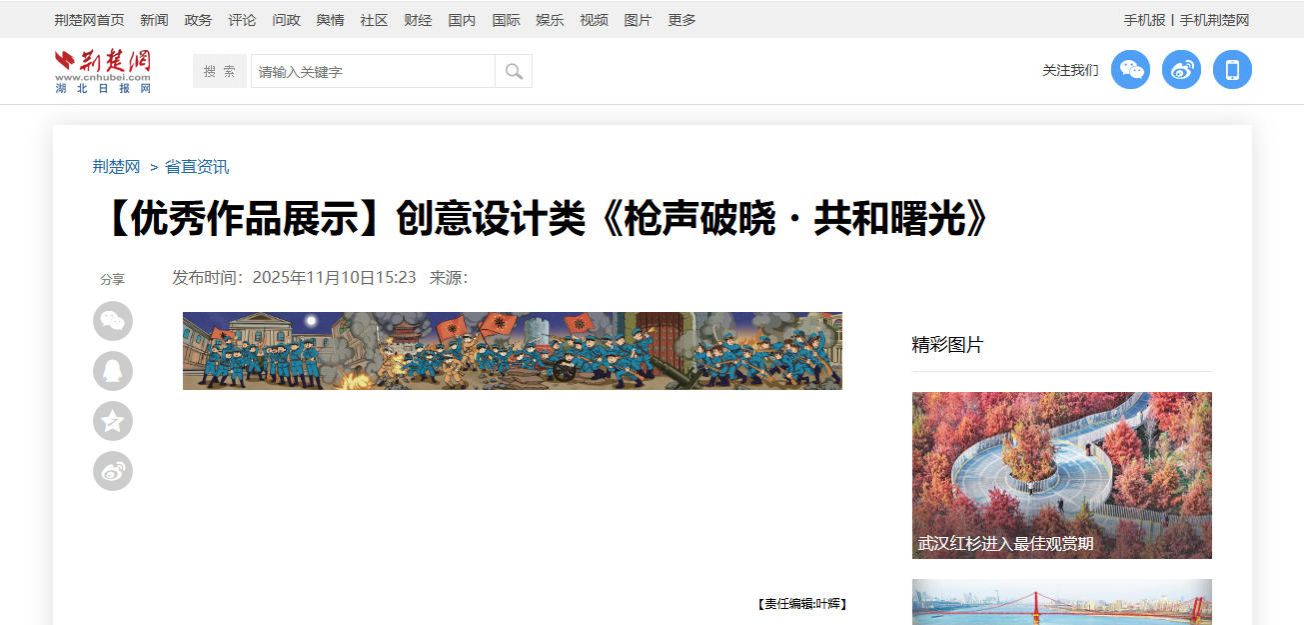 近日,由辛亥革命博物院、武汉市中山舰博物馆、辛亥革命博物院・武汉大学国家革命文物协同研究中心联合主办的“百年辛亥民族丰碑——‘孙中山与辛亥革命’文物传播大赛”优秀作品展线上专题正式上线。我校影视动画学院“动‘话’时代,艺绘中国”工作室师生团队创作的《破晓之路・振兴中华》《枪声破晓・共和曙光》两件作品,在全国417件参赛作品中脱颖而出,入选创意设计类优秀作品,成为高校以艺术之力传承革命文化的生动范例。