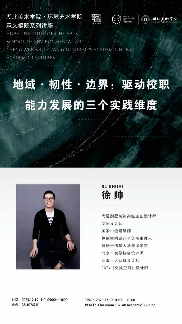 为深化设计教育与行业实践的深度融合,赋能师生专业能力提升,12月19日上午,环境艺术学院在A8-107教室举办以“地域·韧性·边界:驱动校职能力发展的三个实践维度”为题的专业讲座,邀请尚层别墅装饰高级主创设计师徐帅担任主讲人,为学院师生带来一场兼具理论深度与实践价值的行业分享。